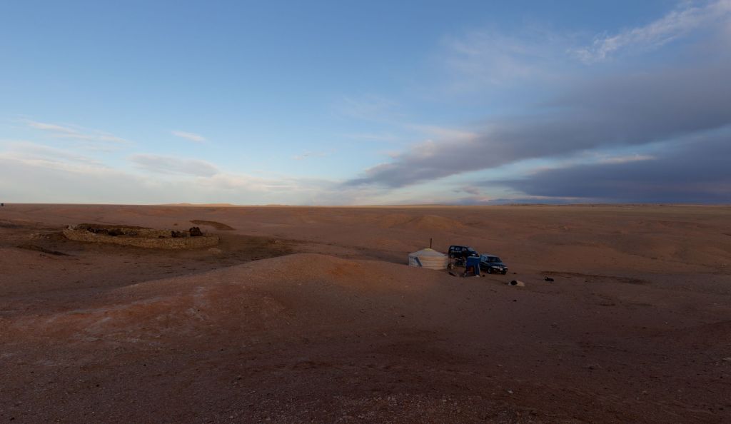 Následujících šest dní jsme cestovali po Gobi do různých míst, jedli jsme skopové, spali v jurtách, pozorovali koně, velbloudy, gazely, orly a supy. Musím říci, že po několika dnech na mě dolehla mírná deprese z toho, že není s kým mluvit, že jsem jen v poušti bez zeleně, že stále jím skopové, sedím celý den v autě, jsem odříznutý nejen od elektřiny, a hlavně je mimo mojí moc to nějak změnit. Ten týden byl dlouhý. Stačilo to. Přestože zpětně, co jsem v Mongolsku viděl, bylo zase něco nového, tak cesta rozhodně nebyla relaxační. Paradoxně v této zemi plné volnosti, kde člověk mohl běhat kam chtěl, řvát, jak chtěl a dělat si co chtě, protože ho nikdo neslyšel ani neviděl, se cítil svázaněji než z přelidněné Číně.