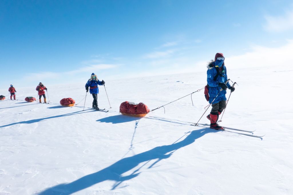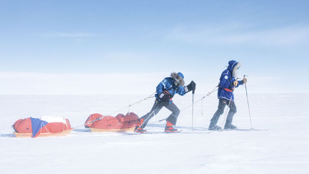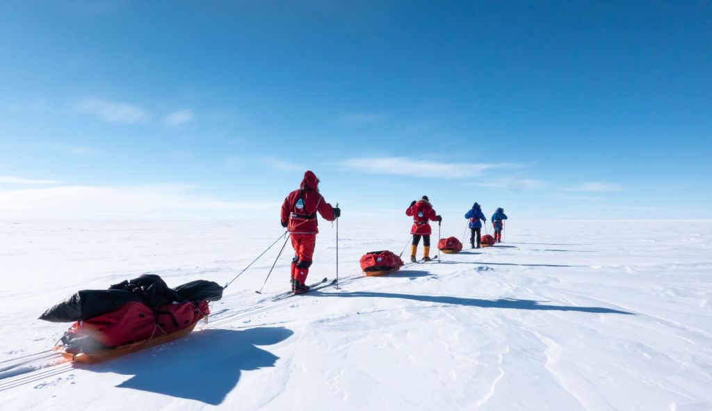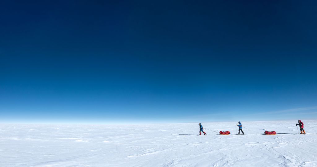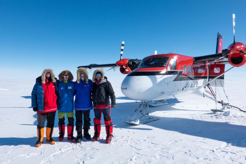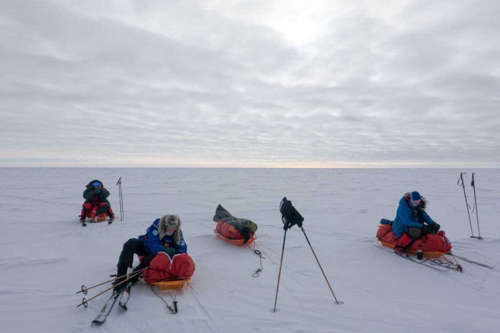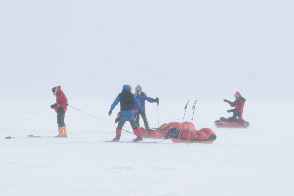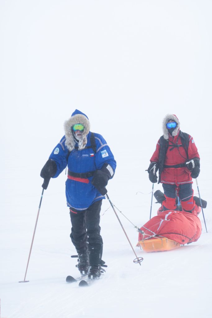 Když po pěti hodinách letadlo konečně přistálo na svých lyžích, naskytl se nám děsivý pohled z okénka. Zataženo, vichr, sníh a nekonečná plocha sněhu bez jediného orientačního bodu. Oblékli jsme se do péřovek a s výstupem z letadla se nám pocity ještě doplnily o -35°C zimu, bolest hlavy z nadmořské výšky a zadýchávání. Letadlo za sebou nechalo jen oblak sněhu a my se na svých lyžích táhnoucí 40 kg vydali na hlavní část výpravy. Přes všechny tyto obtíže jsme byli šťastní že jsme tu a zdraví. Že jsme zvládli tréning, že jsme se nezranili ani nechytli žádnou nemoc, že nebylo zpoždění letadel a my vše stihli. Byli jsme konečně na cestě a k Jižnímu pólu nás už dělilo jen 60 námořních mil pustou krajinou. V jistém smyslu jsme svého cíle již dosáhli.