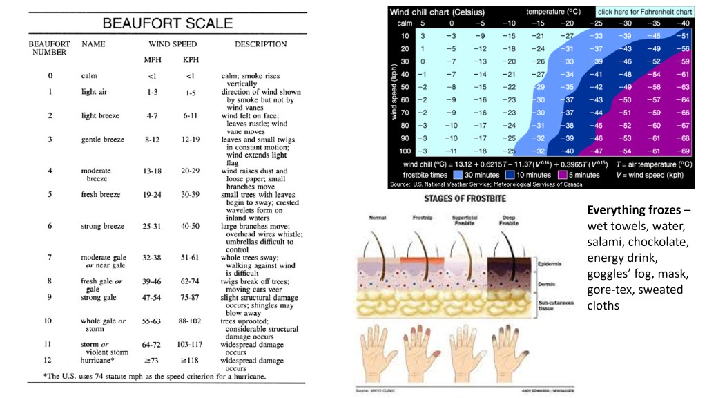Tak například největší zima je, když nejsou mraky, ale čistá obloha. Brýle s kovovými obroučky zapříčiní omrzliny na nose, a to velmi rychle. A to nejhorší, co se může stát je, že se zpotíte. Vážně, já si to zkusil. Jakmile jsem toho měl na sobě moc, tak měl polil pot a sebral mi veškerou energii, najednou se šlo strašně špatně a každý krok byl utrpení. Navíc jsem riskoval, že si zpotím základní vrstvu, která pak zrzne a já už to tady v těch podmínkách neusuším. Daleko důležitější, než teplota vzduchu je tzv. pocitová teplota. Pocitová teplota kombinuje teplotu vzduchu s rychlostí větru. Myšlenka je taková, že když nefouká vítr, tak tělo ohřívá vzduch kolem sebe a vytváří mikroklima, které tělo chrání před zimou. Ale vítr, tento ohřátý vzduch odfoukne. To je pocítitelné zejména na holé kůži. Když byla například teplota vzduchu -25 °C, a foukal vítr, že pocitová byla -35 °C, tak v praxi to vypadalo asi následovně. Sedl jsme si na sáně, tak že mi vítr foukal do zad a vybalil si jídlo. V té teplotě jsem si dovolil sundat na chvíli rukavice a dokud jsem ruce držel u těla, kam vítr nemohl, tak jsem byl v pohodě a mohl jsem v klidu jíst. Vytvořilo se tam dostatečné mikroklima. Jakmile jsem dal ruku, byť jen na vteřinu do větru ruka mi zmrzla a bolelo mě to další půl hodinu. To byl samozřejmě případ vždy, když jsem vytáhl foťák, že budu fotit. Za každou fotkou z cesty jsem zaplatil půl až hodinou bolestí zmrzlé ruky a celkově jsem si odnesl pár omrzlin.