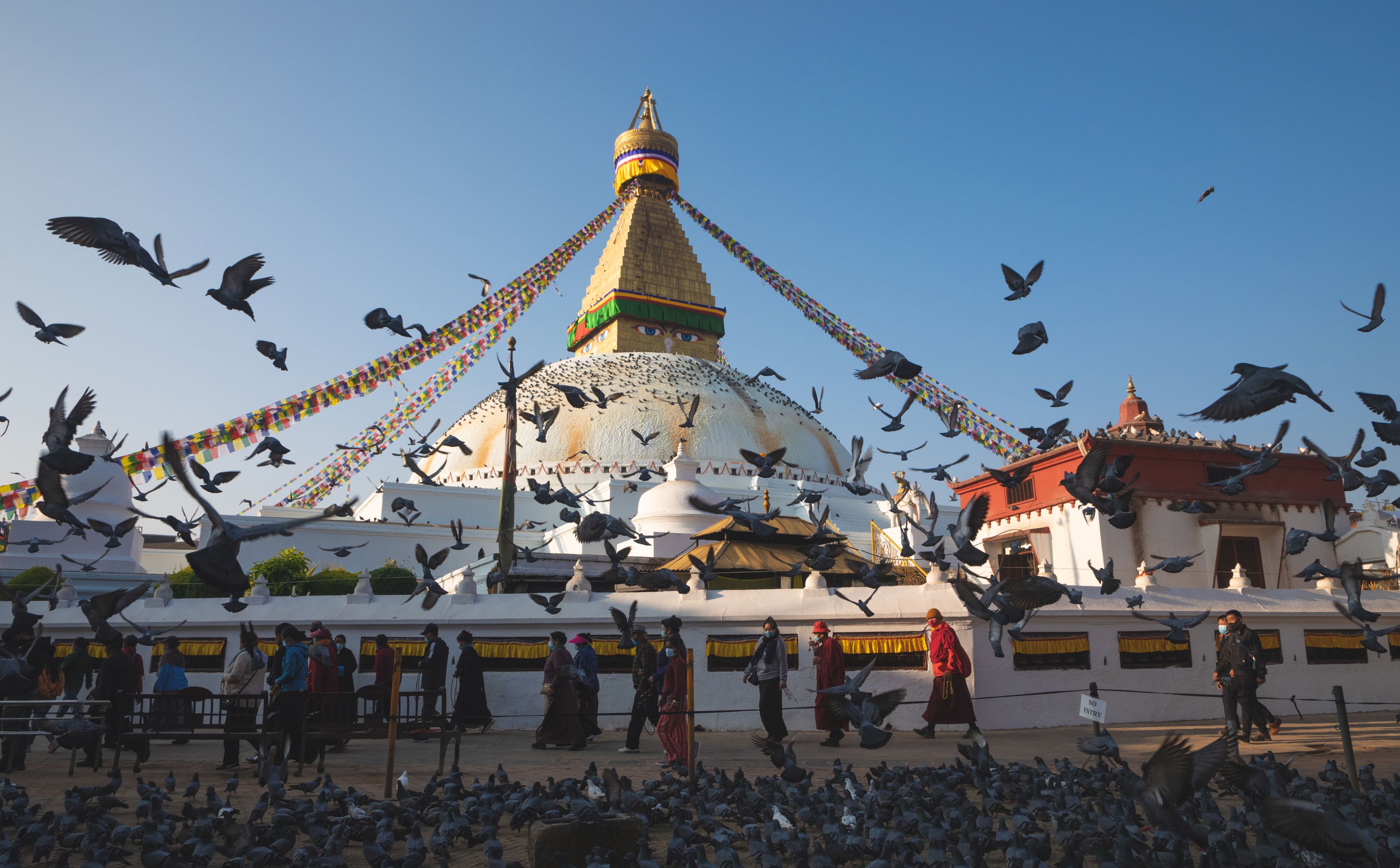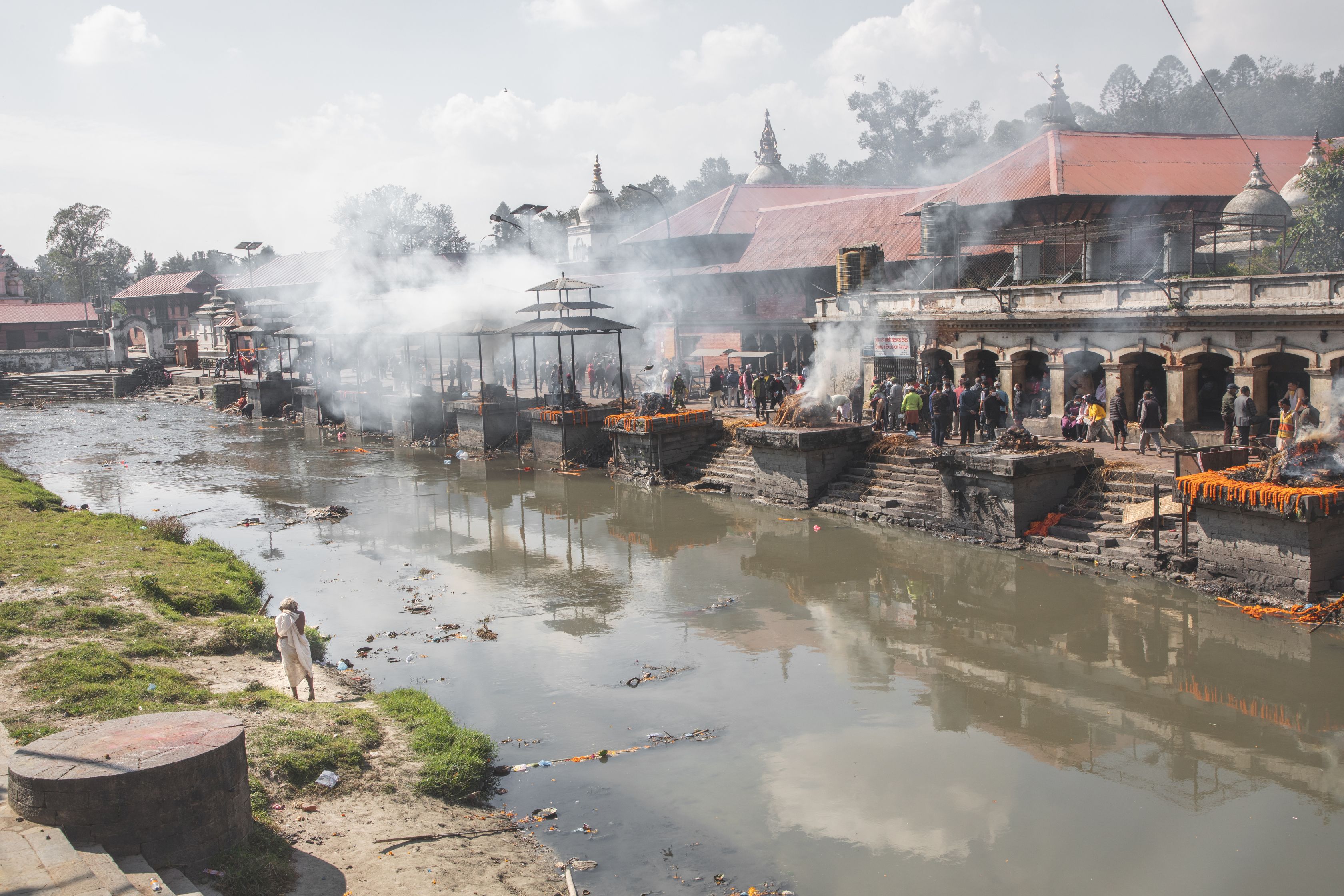 Kathmandu jsme si prohlédli až na závěr cesty, ale sem do knihy popíši zážitky teď. Měli jsme dva dny na prohlídku. Nejprve jsme jeli do vesnice Budhanilkantha podívat se na plovoucí sochu Višnu a večer se prošli po přeplněném Thamelu až k Durga square. Druhý den pak jsme se rikšou přiblížili k Monkey Temple, ale nechtělo se mu do kopce, tak nás vyklopil ještě 20 minut pěšky od místa a zase se mi potvrdilo, služby těhle rikšáků nebrat. No nicméně jsme si pospíšili a do schodů Monkey Tempelu jsme vyběhli akorát na východ slunce. V tomto klášteře tibetského budhismu byl pěkný výhled na ošklivý Kathmandu, hodně opic a lidé co cvičili jógu. Odtud jsme se přesunuli ke Boudha stupa, kde vyznavači tibetského buddhismu kroužili kolem Buddhových očí. Párkrát jsme to s nimi obešli, já jsem tam omylem skopl nějaké kadidlo, pak jsme tam bafli na holuby kvůli fotce a nakonec si dali skromnou snídani. Pěšky jsme se přesunuli k velkému komplexu Pashupatinah. Do hinduistického templu nás nevpustili, ale mohli jsme se projít po spalovnách mrtvých ne nepodobné těm, co jsme viděli ve Varanásí. Nejprve mi trochu zkazilo náladu, jak tam po nás všichni chtěli peníze za vstup, za průvodcování, za suvenýry, za mrtvé, za fotku se svatými muži… no ale pak když jsme byli uvnitř, tak se dojem dost zlepšil. Šlo o spirituální místo s hutnou atmosférou tak, jako ghátu ve Varanásí. Viděli jsme tam několik svatých mužů a pohřbů. Nakonec jsme si odpočali v zahradách u Thamelu, kam zřejmě lidé platí vstup, aby si oddychli od ruchu přeplněných ulic. No a těsně před odletem jsme si prošli extrémně rušné uličky Thamelu.
