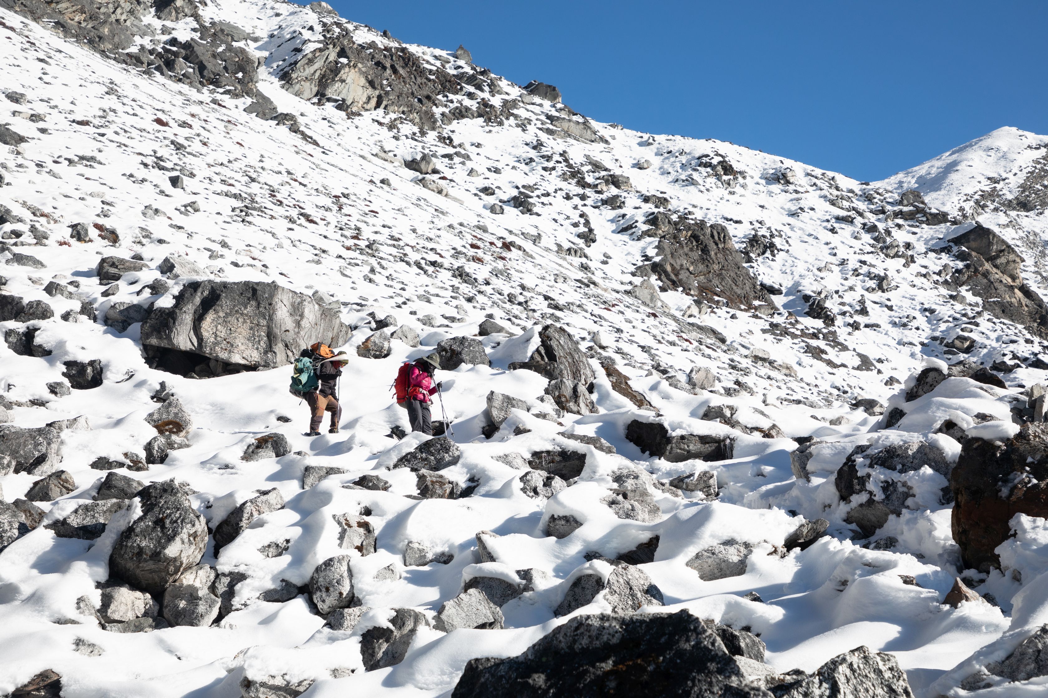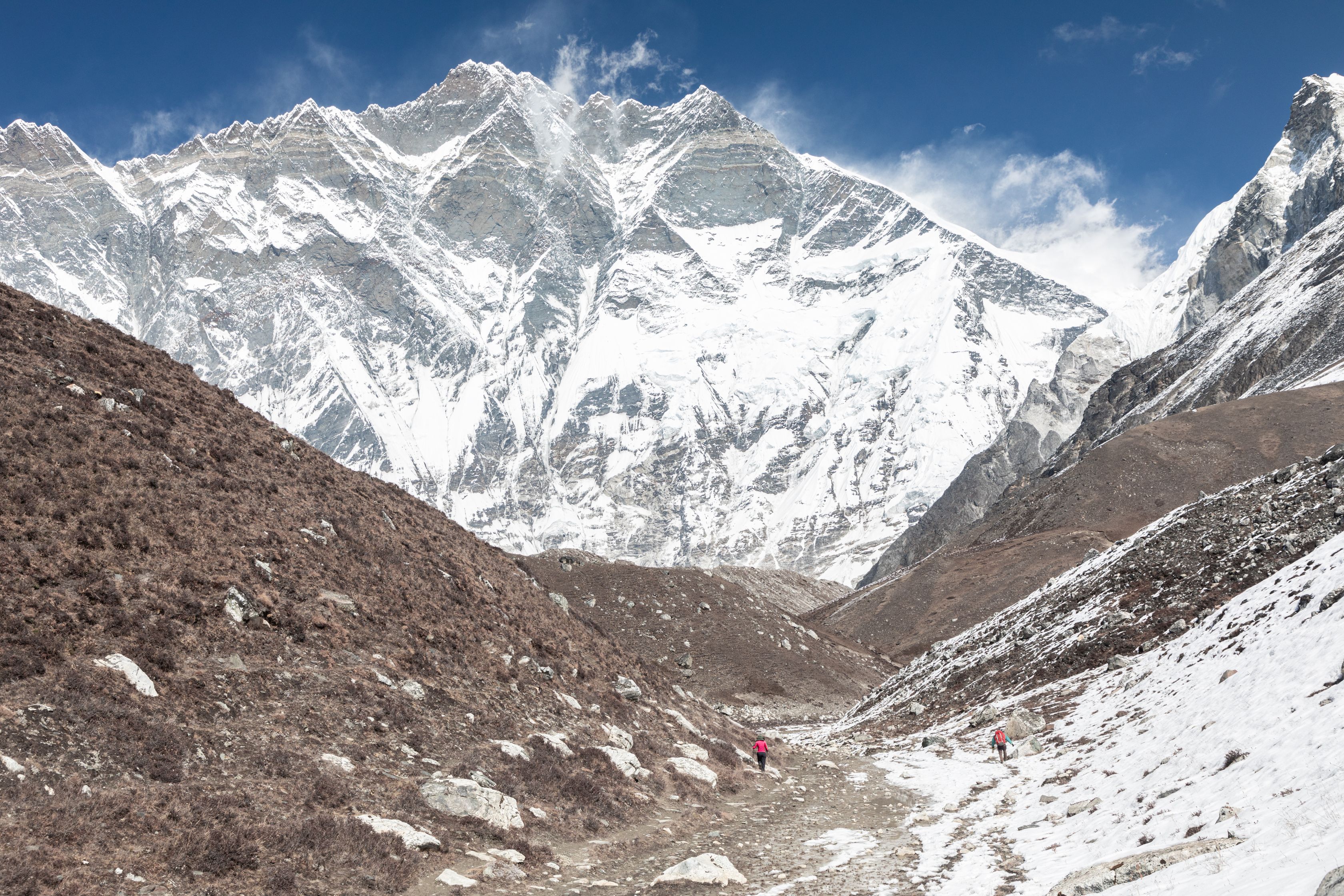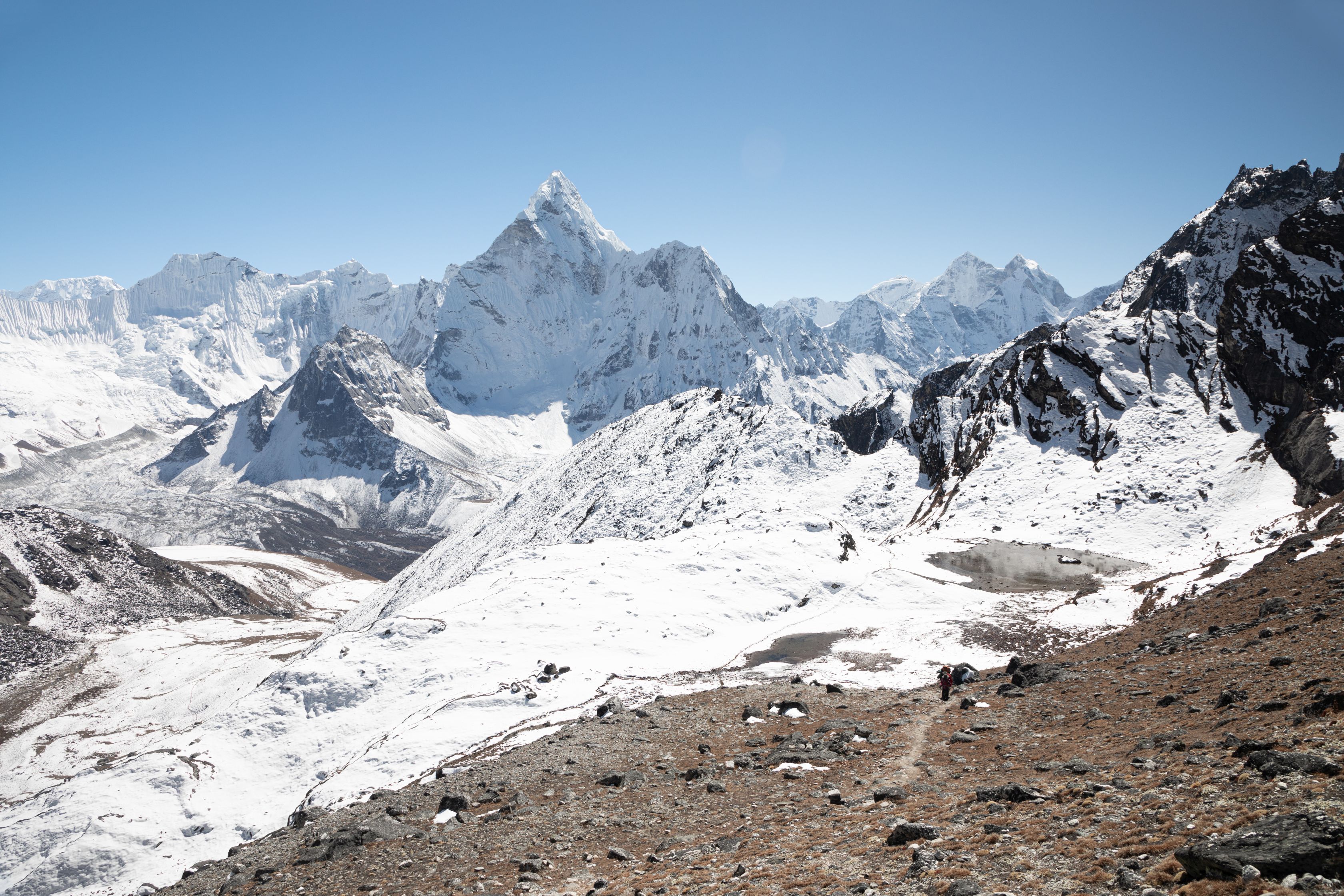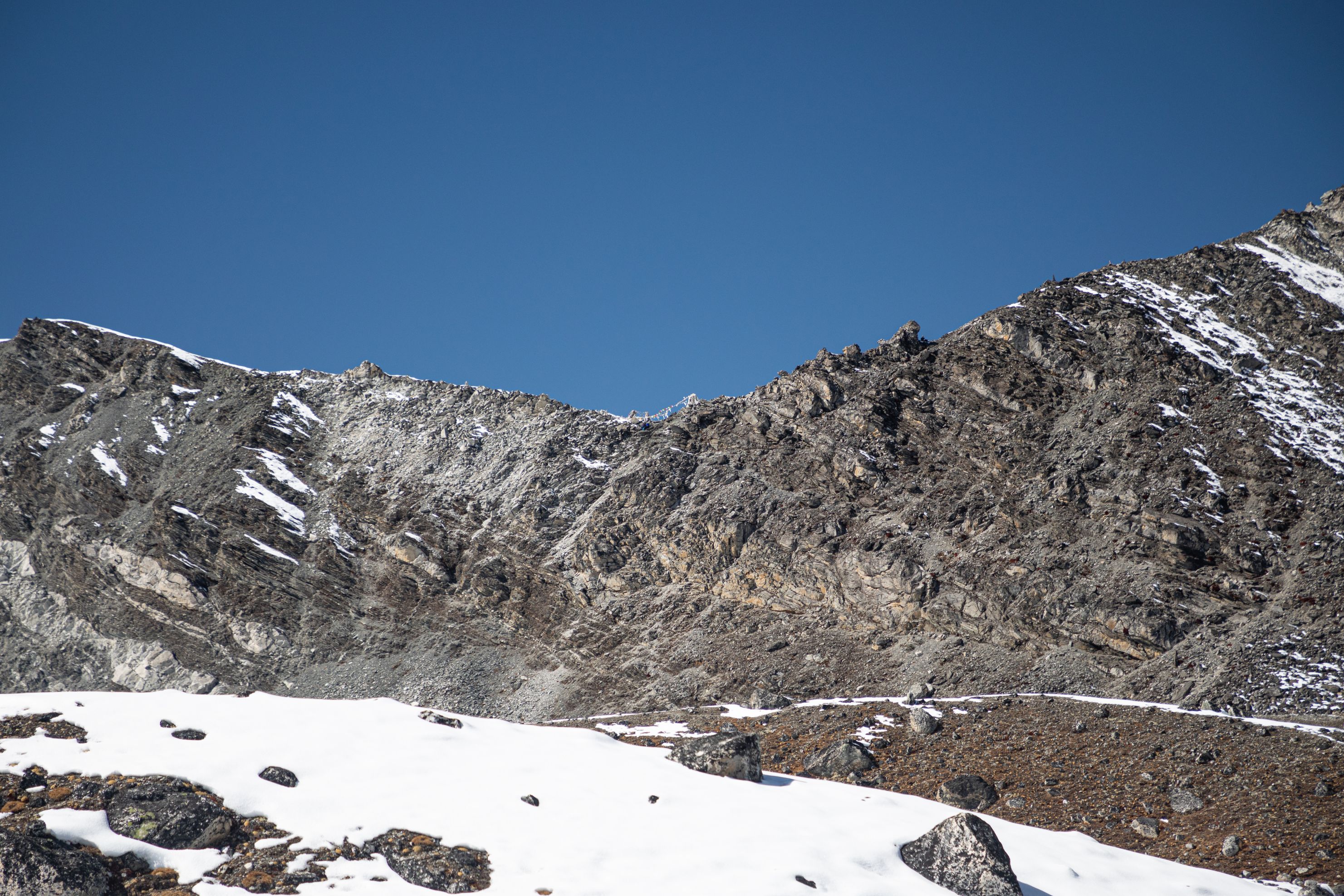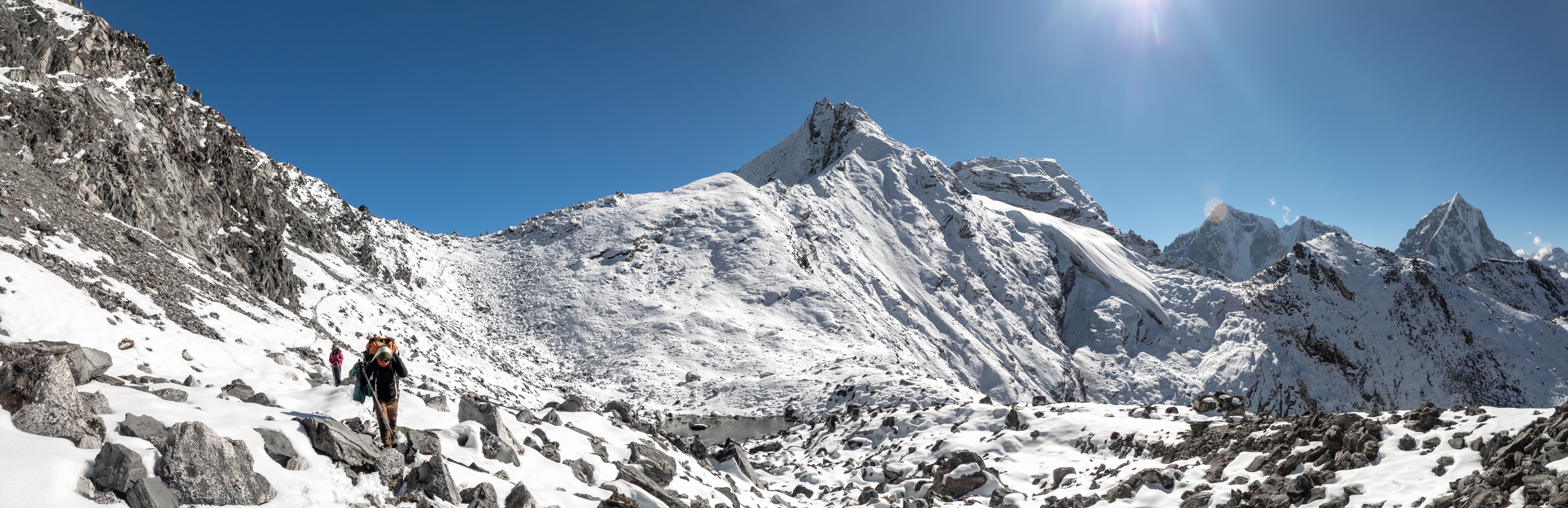 Byl vysoko nad námi na téměř strmé stěně. Bylo už asi 13:00 a potkali jsme první lidi, kteří šli opačným směrem. V tu chvíli mě zachvátily obavy. Myslel jsem, že mezi 15-16h budeme na druhé straně v Lobuche, ale těmto plně aklimatizovaným sportovně vyhlížejícím trekařům to trvalo minimálně sedm hodin se dostat sem z druhé strany, což měla být snadnější cesta. Co nás tedy ještě čeká??