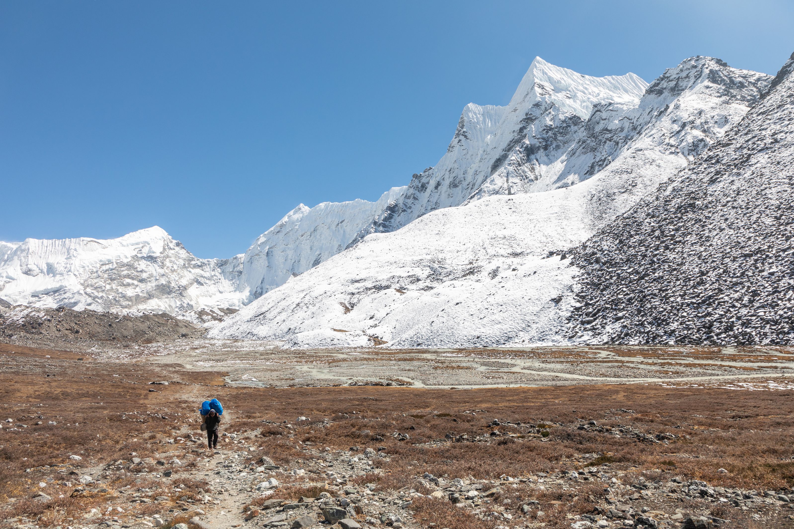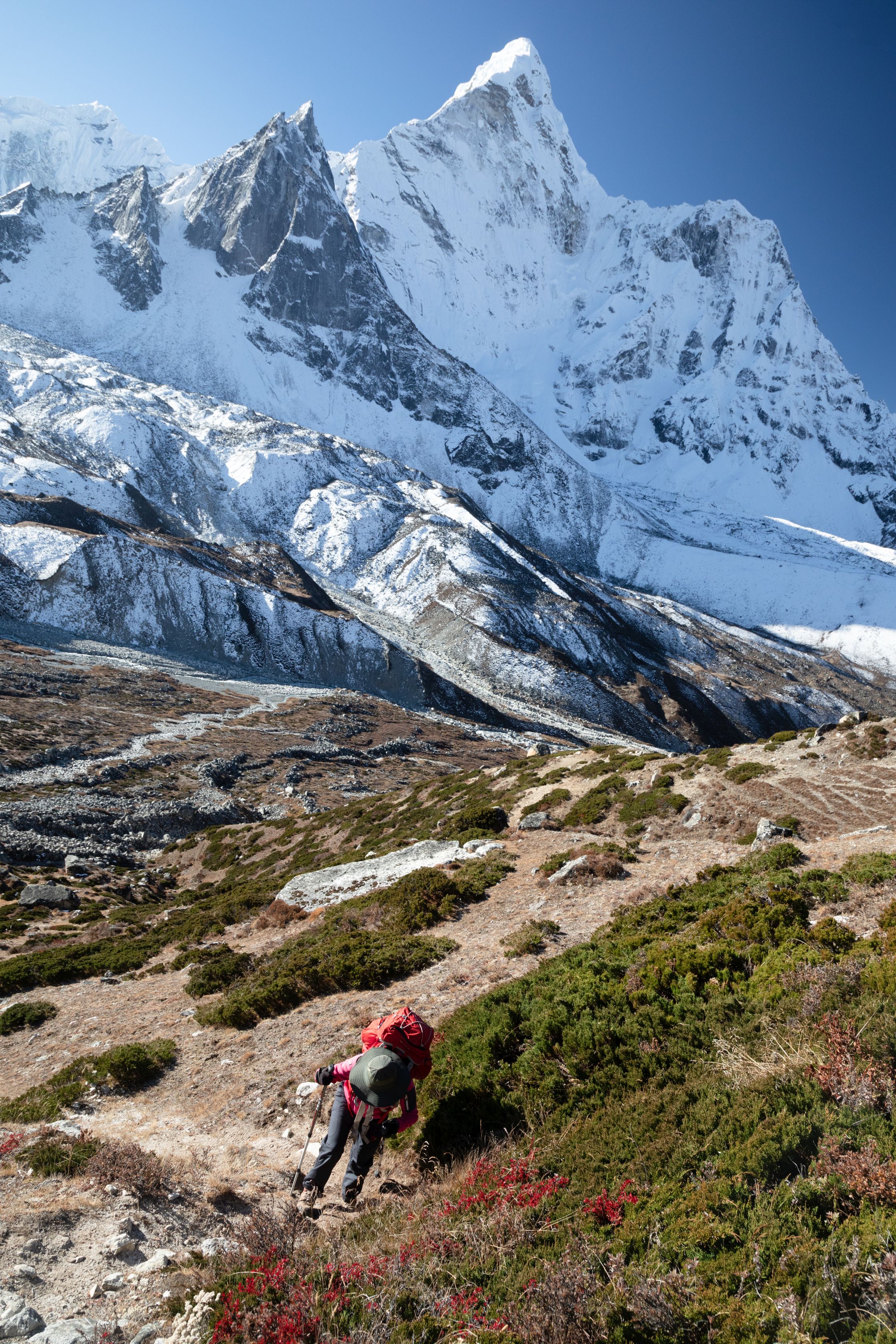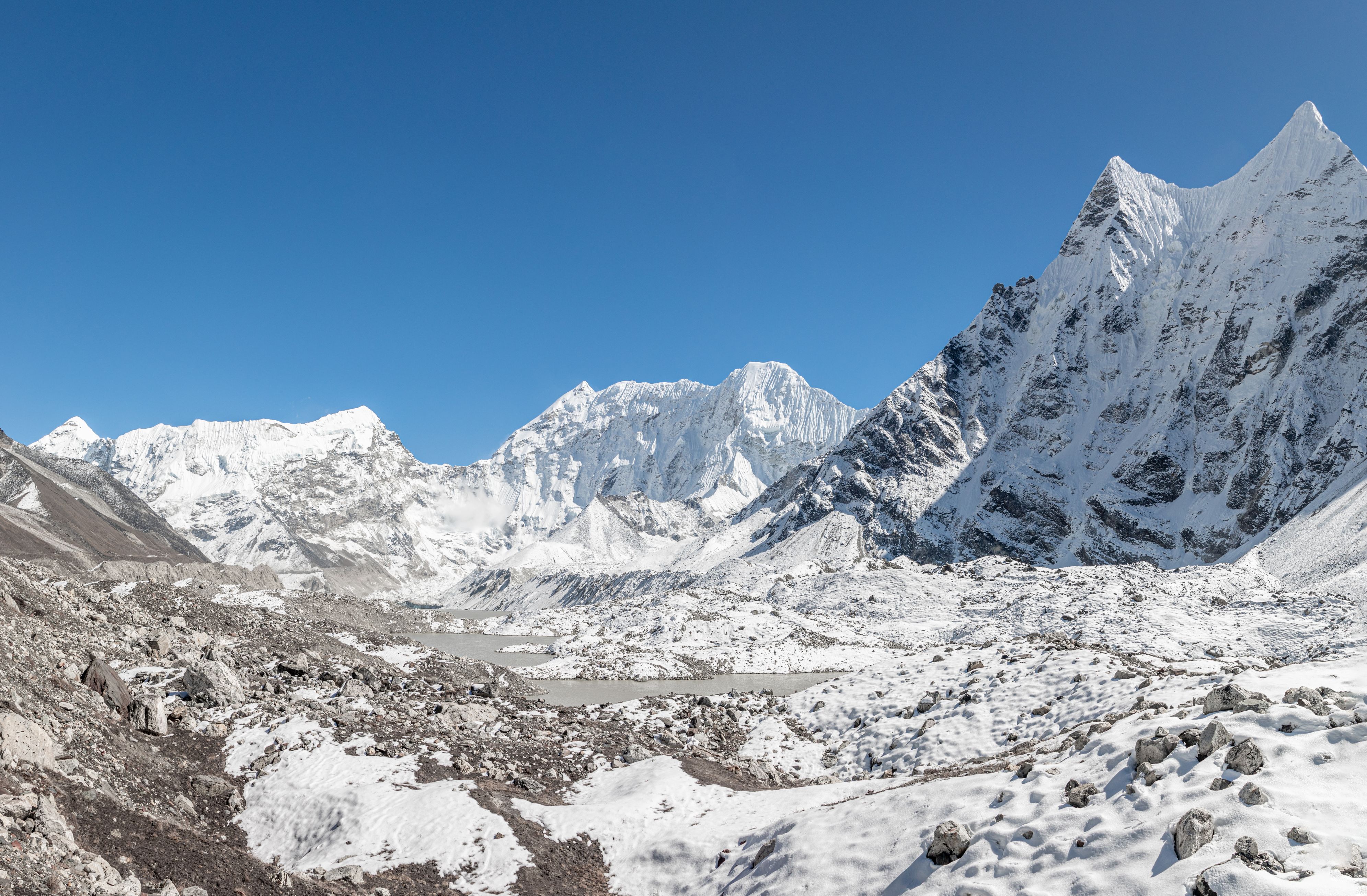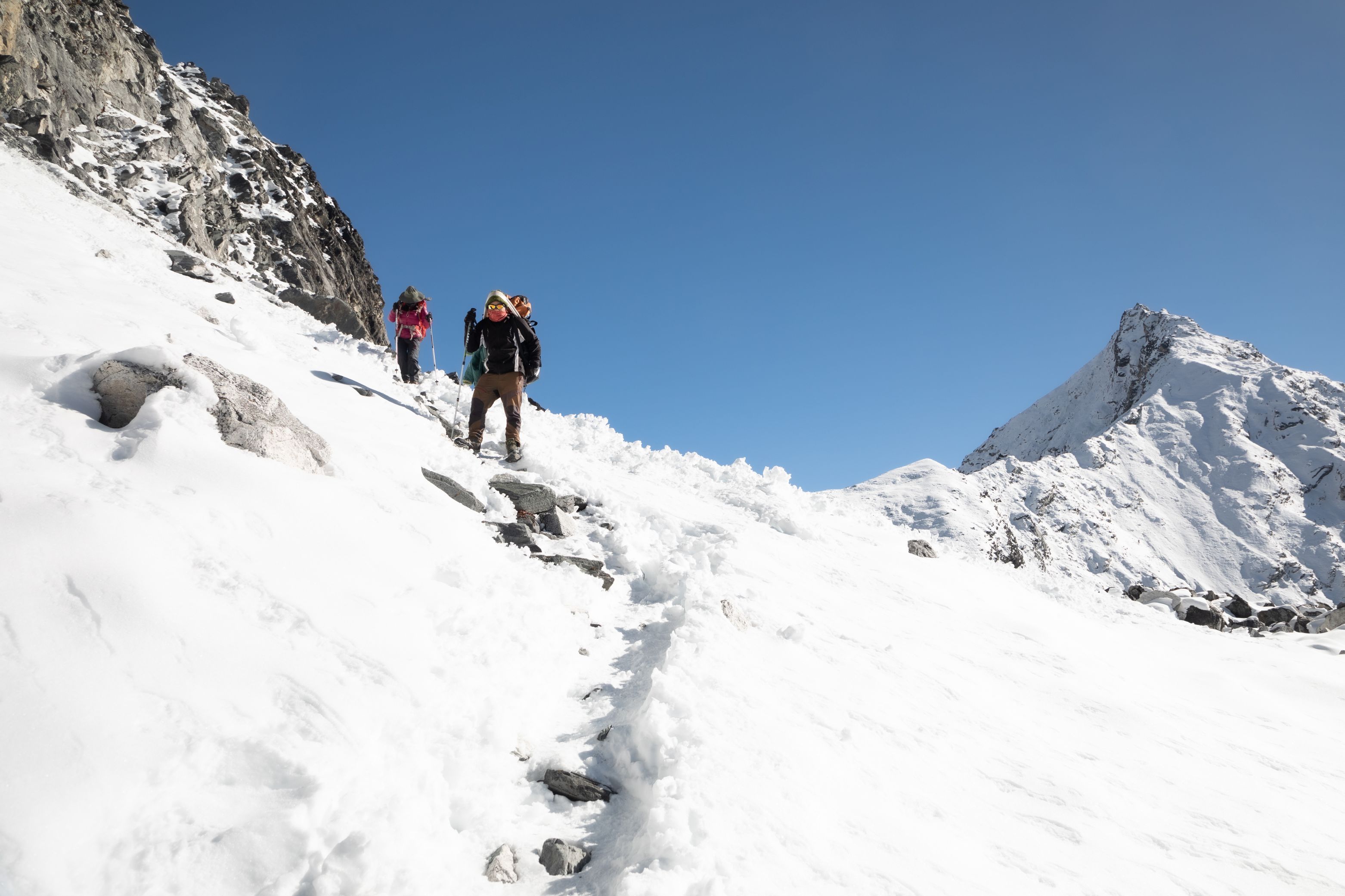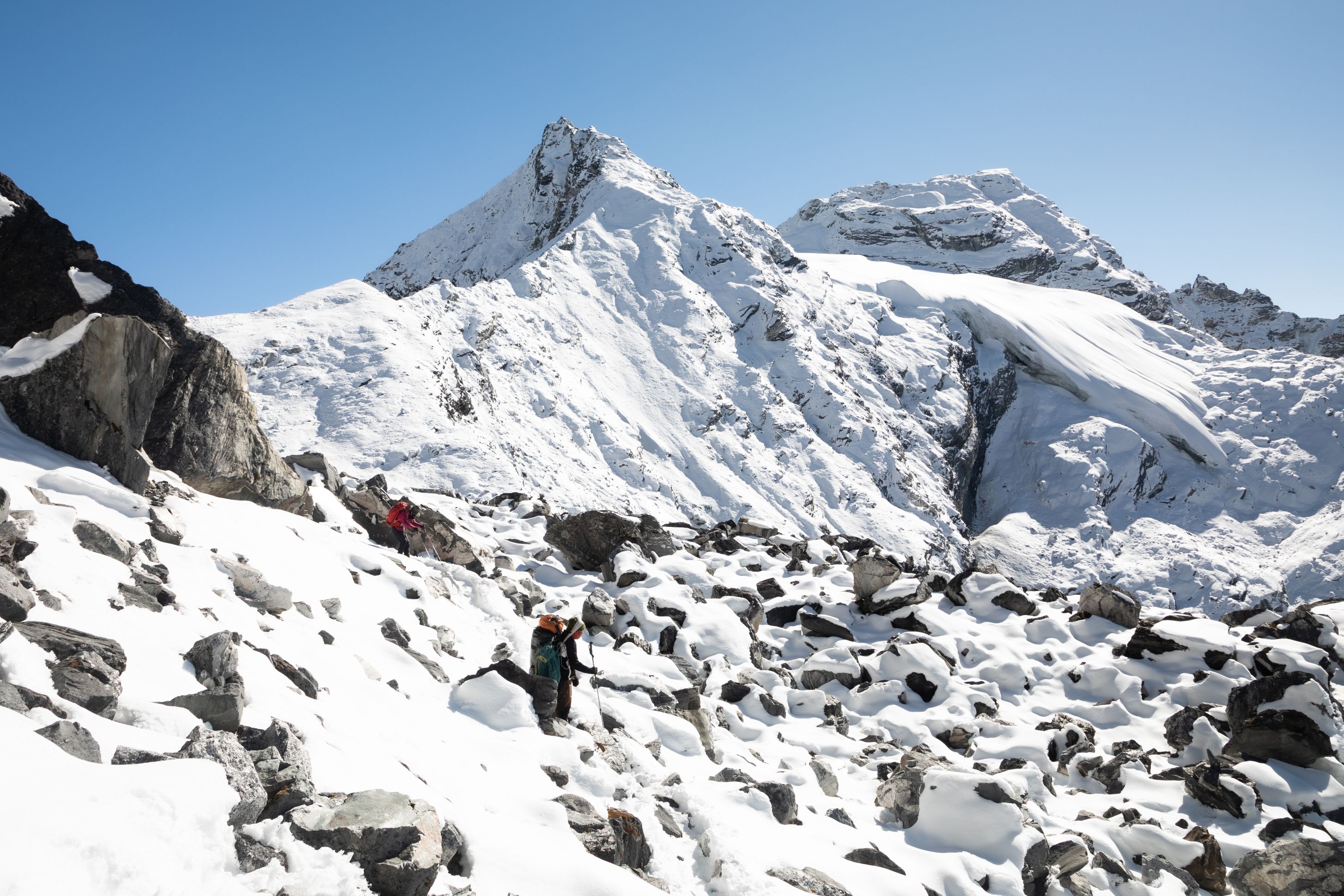 Byl vysoko nad námi na téměř strmé stěně. Bylo už asi 13:00 a potkali jsme první lidi, kteří šli opačným směrem. V tu chvíli mě zachvátily obavy. Myslel jsem, že mezi 15-16h budeme na druhé straně v Lobuche, ale těmto plně aklimatizovaným sportovně vyhlížejícím trekařům to trvalo minimálně sedm hodin se dostat sem z druhé strany, což měla být snadnější cesta. Co nás tedy ještě čeká??