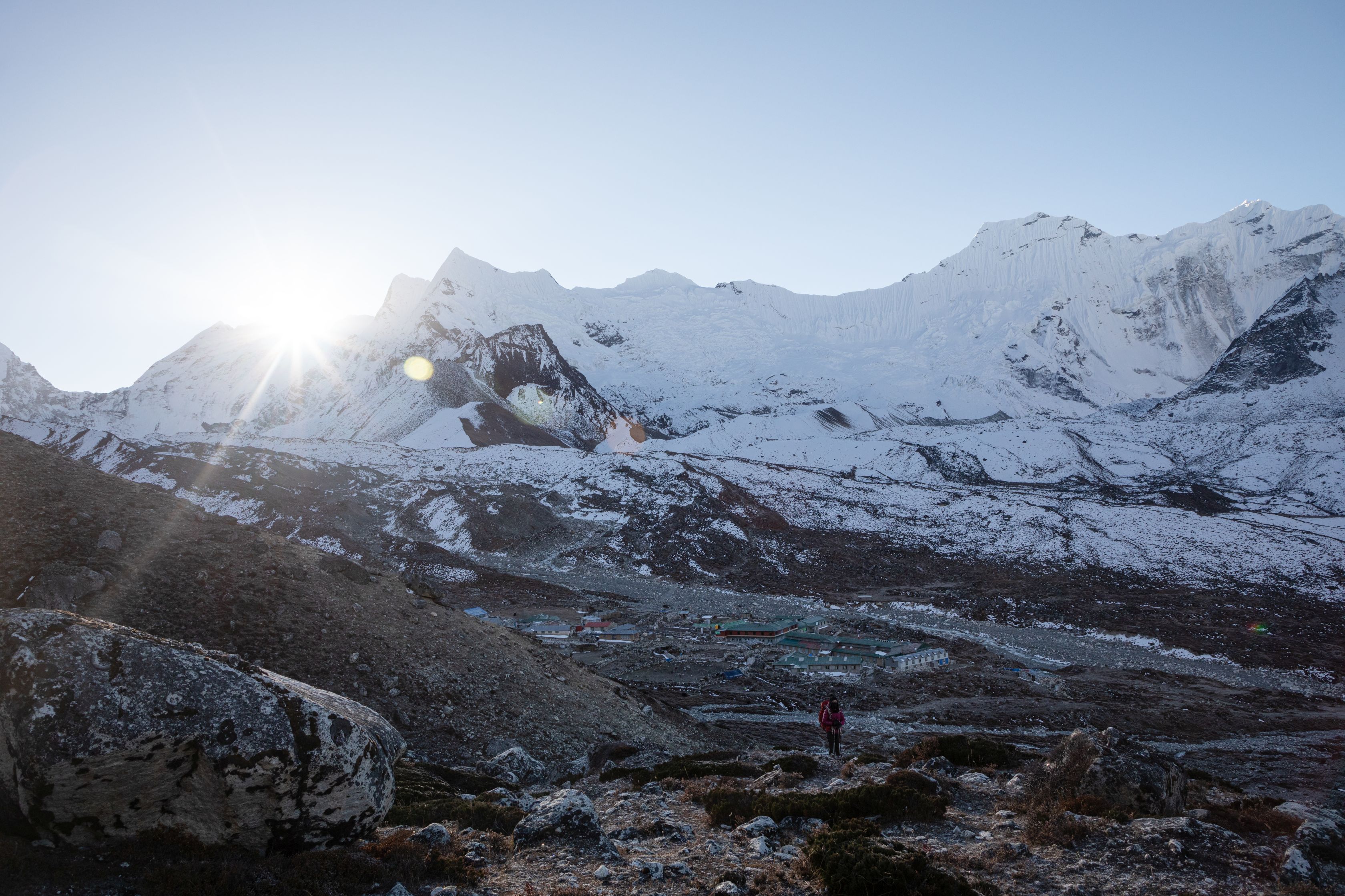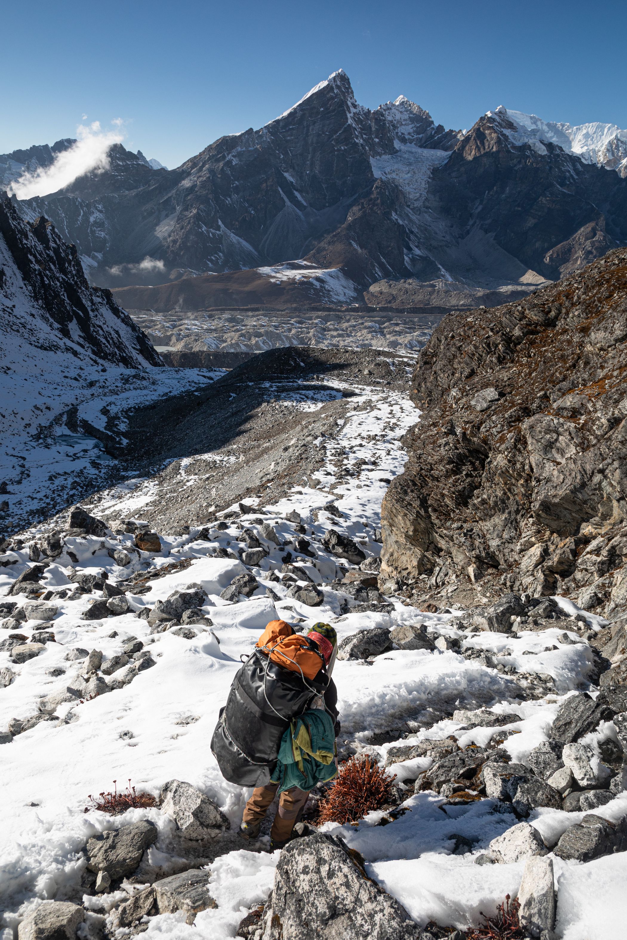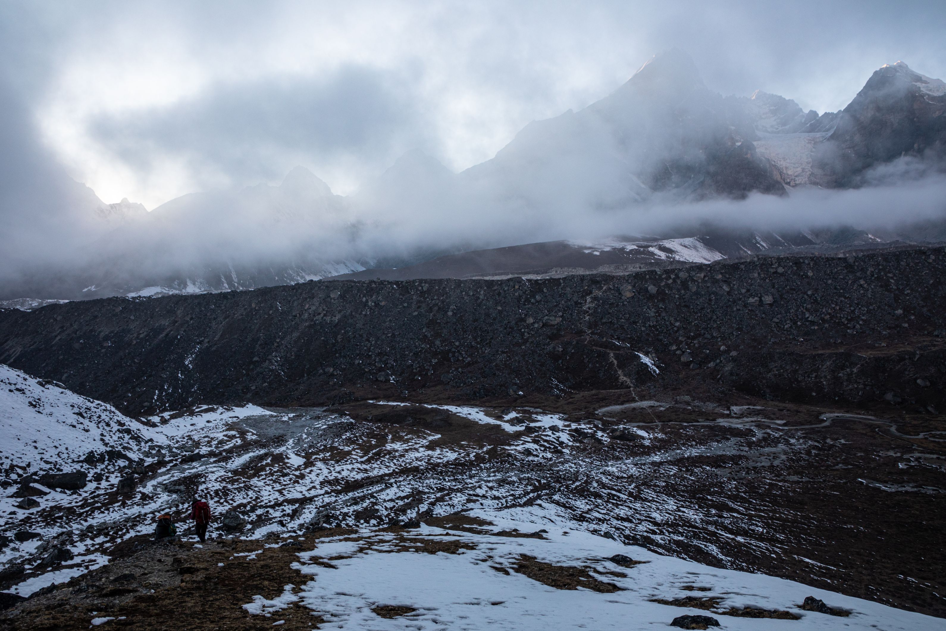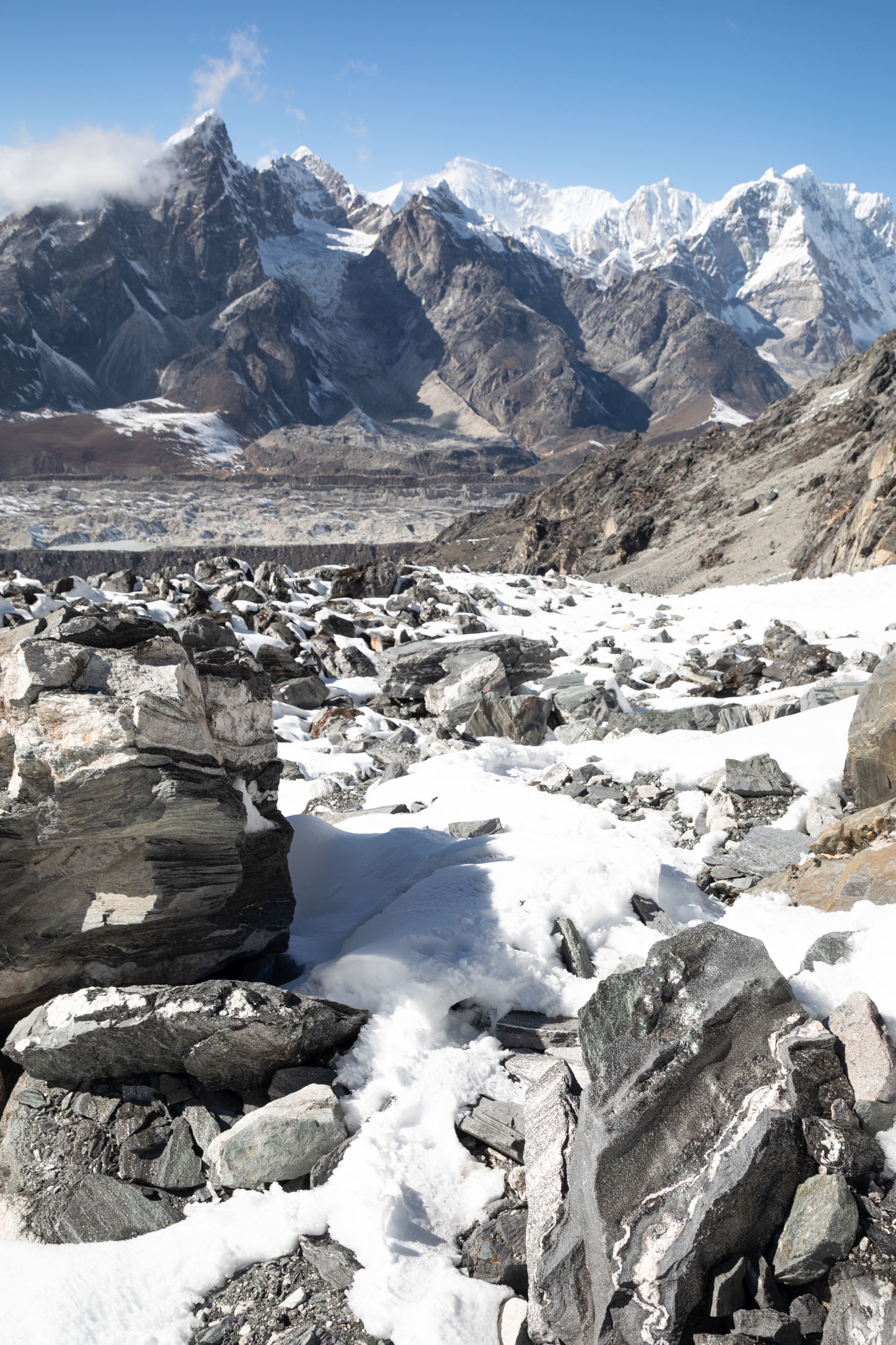 Už po pár metrech jsem pochopil, že to nebude žádný med. Lobuče bylo hluboko pod námi a od úpatí hory co jsme lezli nás od něj ještě dělil ledovec Khumbu. A hlavně cesta dolu byla zatraceně strmá a jelikož šlo o neslunečnou stranu, tak ty kameny byly pokrytu proklatě kluzkým sněhem a ledem. Šlo to dolu hodně pomalu, bylo to nebezpečné. Meiting v jednu chvíli spadla a měla z toho slušný bolehlav a několik dalších hodin a cítila to i další dny. Mírnou vejškovku jsme pociťovali oba, ale naštěstí nebyla tak hrozná, aby nás významně omezovala.