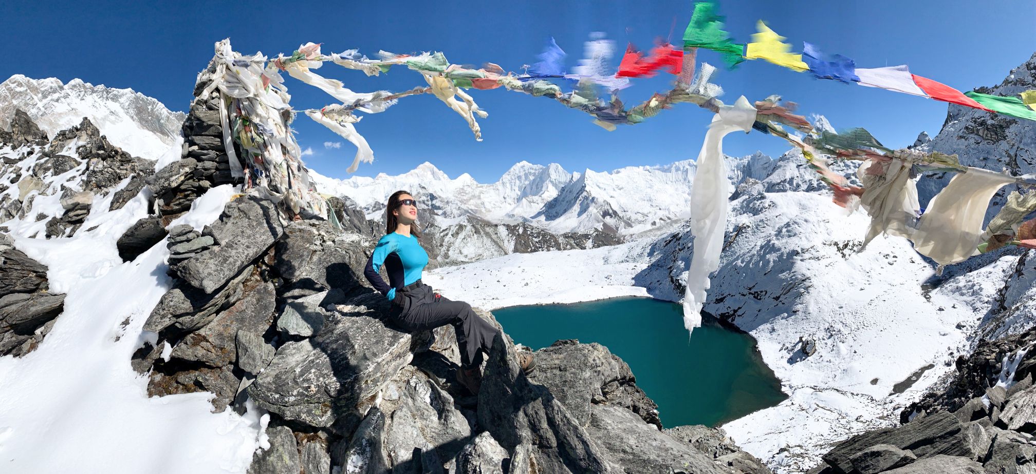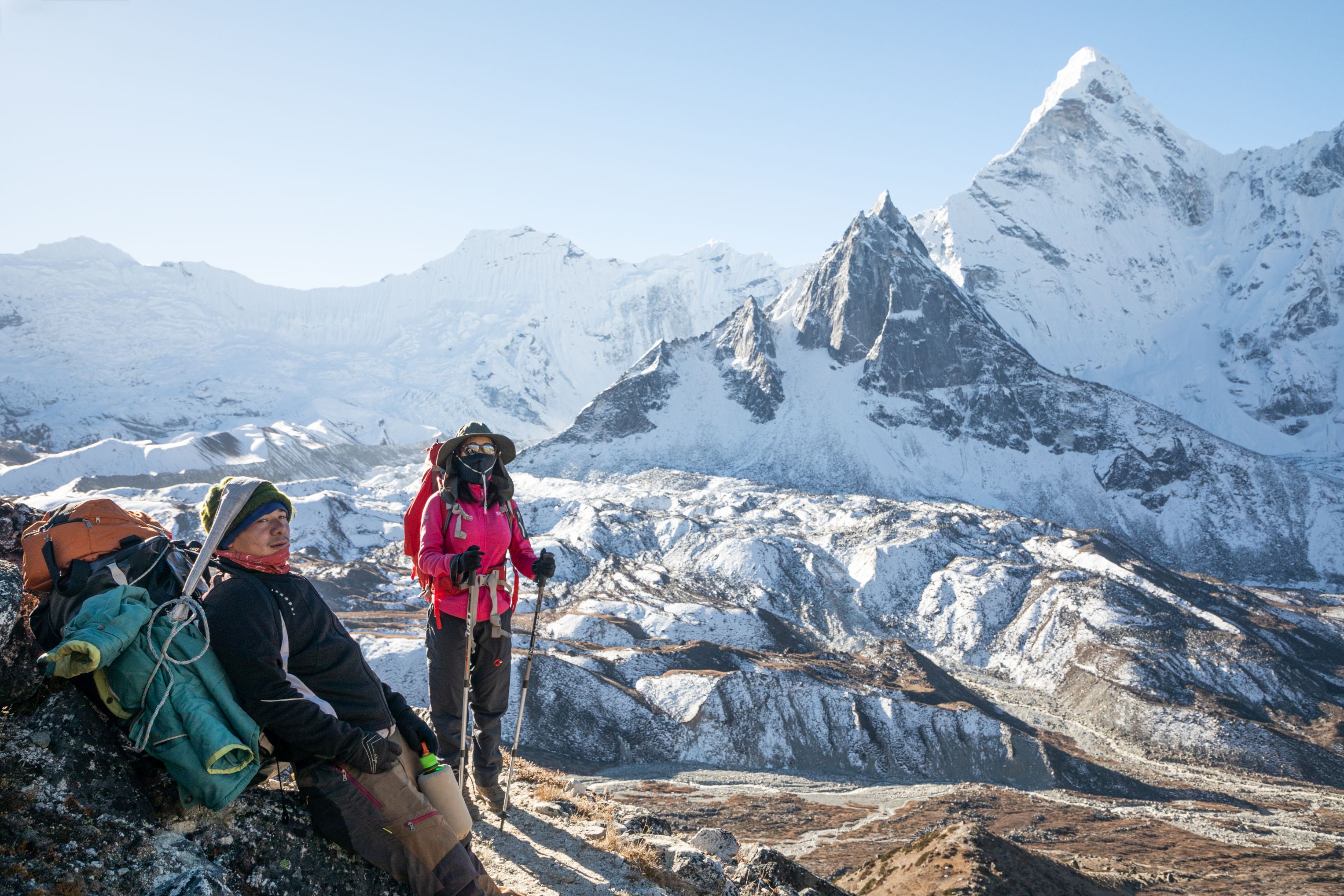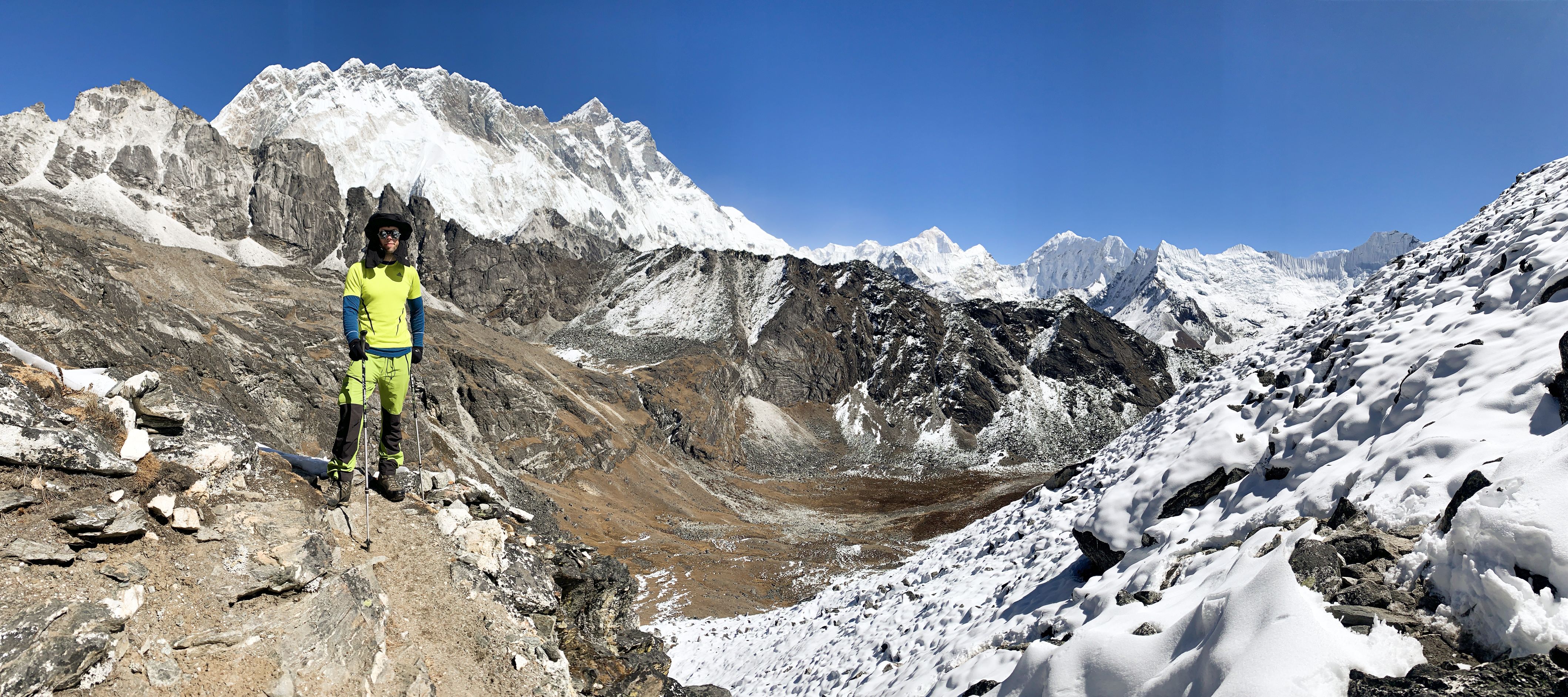 Vyšplhali jsme se do Khongma-la pass do 5535m po té strmé nebezpečné cestě a ocitli se na tenkém hřebeni, kde se nám otevřel neskutečný 360 stupňový výhled na dvě krásná nepálská údolí. Meiting mi později řekla, že to byl pro ní nejkrásnější moment z celé cesty. Udělali jsme hromadu fotek a ve 14:15 započali sestup po severozápadní stěně k Lobuche.