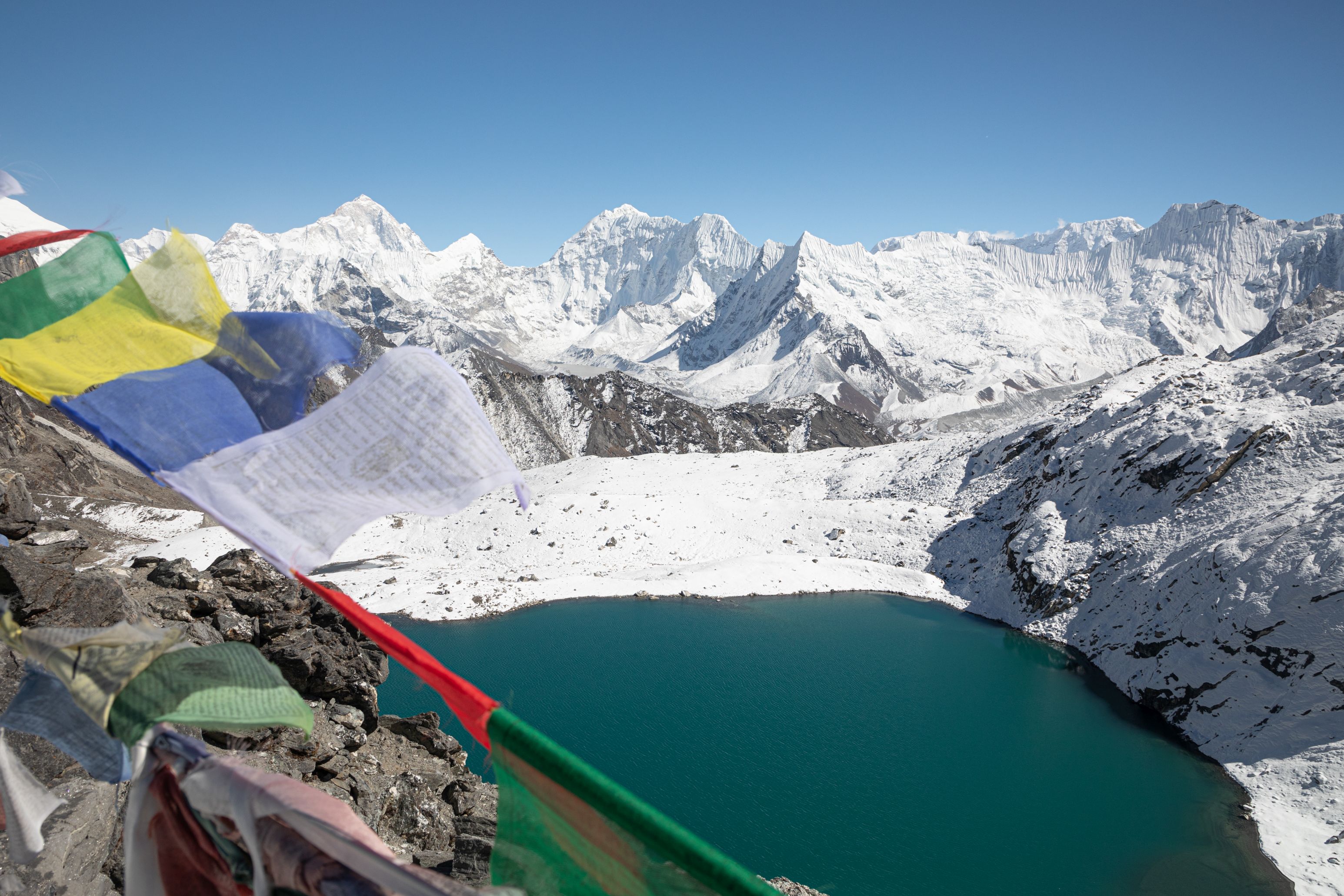 Khongma-la pass. Vstali jsme v 5:15 a vyrazili v 6:30 z Chukhungu (4730m). Nejdřív jsme vystoupali asi 50 výškových metrů, abychom vzápětí zjistili, že jdeme blbě a museli se vrátit na start. Takže první půlhodinka byla ztracena. Pak když jsme konečně chytli správnou stopu, tak to bylo takové Himalájské stoupání. Pořád se otevíraly další hřebeny a už to začínalo být docela dlouhé. No a pak se nám otevřel pohled na průsmyk, který jsme si mysleli, že je náš cíl. Bylo to dost strašidelné a docela mi dělalo problém si představit, že to polezeme. Dva kopečky a pak strmá sněhová stěna. Tak strmá, že se Meiting dělaly závratě. Šel jsem napřed, a když jsem to vylezl, tak jsem jí šel naproti dolu vzít batoh. Vylezli jsme tu stěnu a užili si nádherný výhled na Ama Dablam, Nuptse a Lhotse než jsme zjistili, že zdaleka na vrcholu nejsme! Před námi se otevřela velká plocha s několika kopci. Přešli jsme jeden, druhý, třetí, což mimo jiné znamenalo překonání říček po kluzkých kamenech. Pak konečně za další dva kopce a pohledy na krásná jezera jsme uviděli Khongma-la pass.
