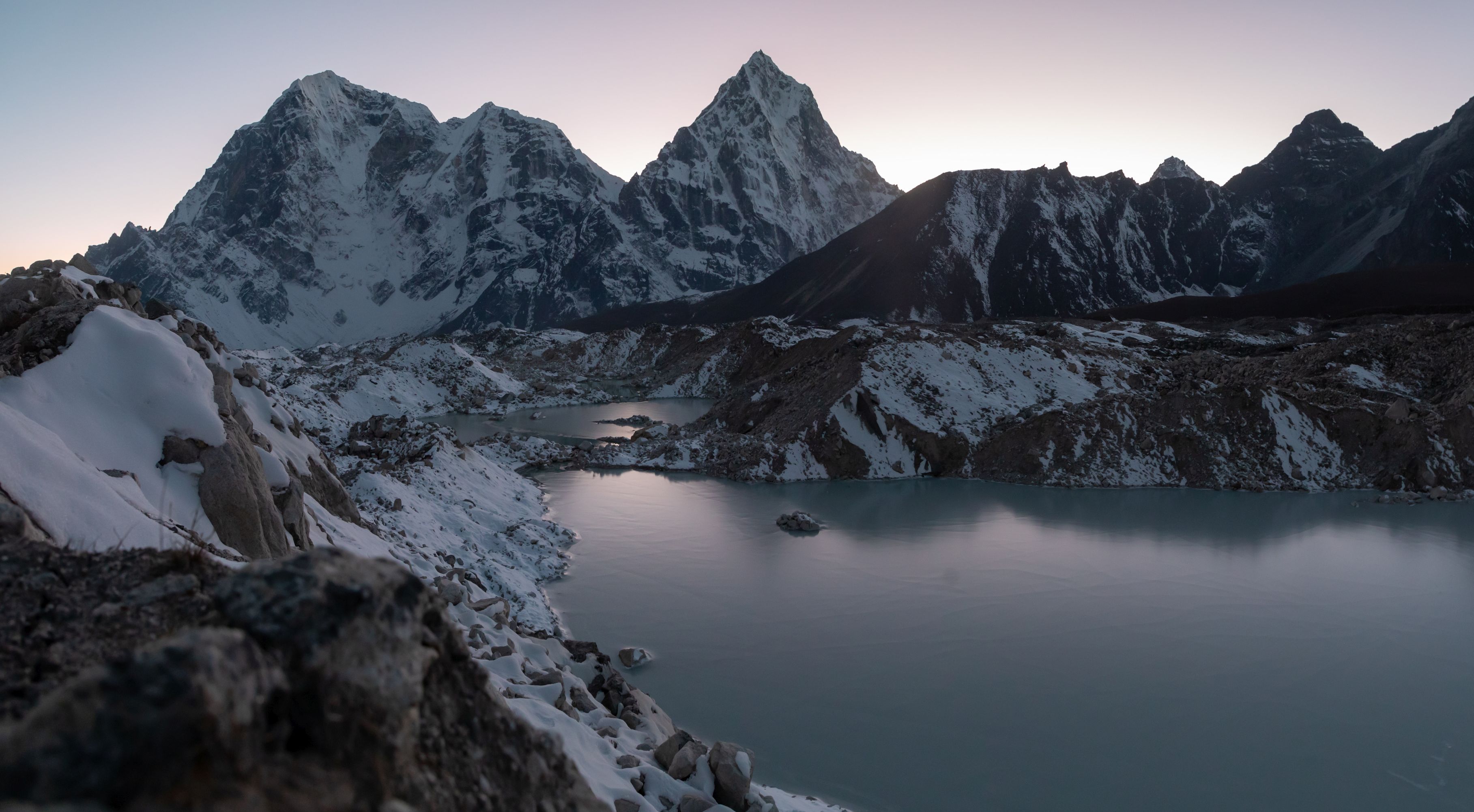 Pod prvním, ale zdaleka ne posledním kamenopádem jsme si dali pozdní oběd a dohnala nás američanka Kathy, která se k nám přidala. Až dolu k moréně to byla kombinace sněhových kamenopádů a mokrých úseků, museli jsme jít pomalu. K moréně jsme dorazili v 16:48, zastihla nás Nicota, která se ale v zápětí roztrhala a už se začínalo stmívat. Naskytl se nám však úchvatný pohled na Pumori zalitou večerním světlem. Přestože jsme byli docela aklimatizovaní, pořád jsme byli ve výšce kolem 5000 metrů a to náš postup zpomalovalo. Teď nás čekalo několik hodin po ledovci do Lobuche. Kolem 17:30 jsem udělal ještě fotku jezera v ledovci, ale slunce bylo již zapadlé. Rozsvítili jsme čelovky a zbytek cesty pokračovali ve tmě.