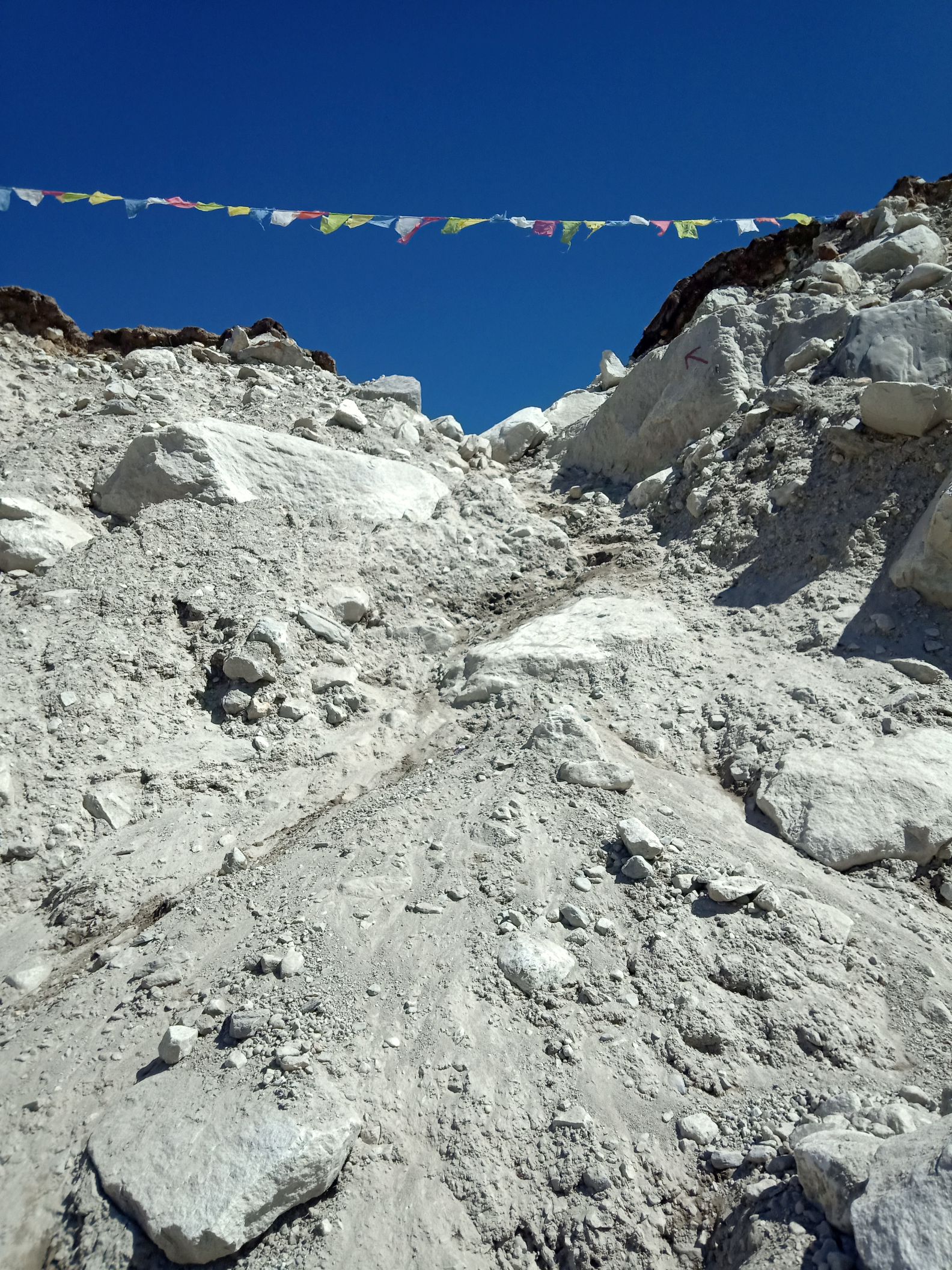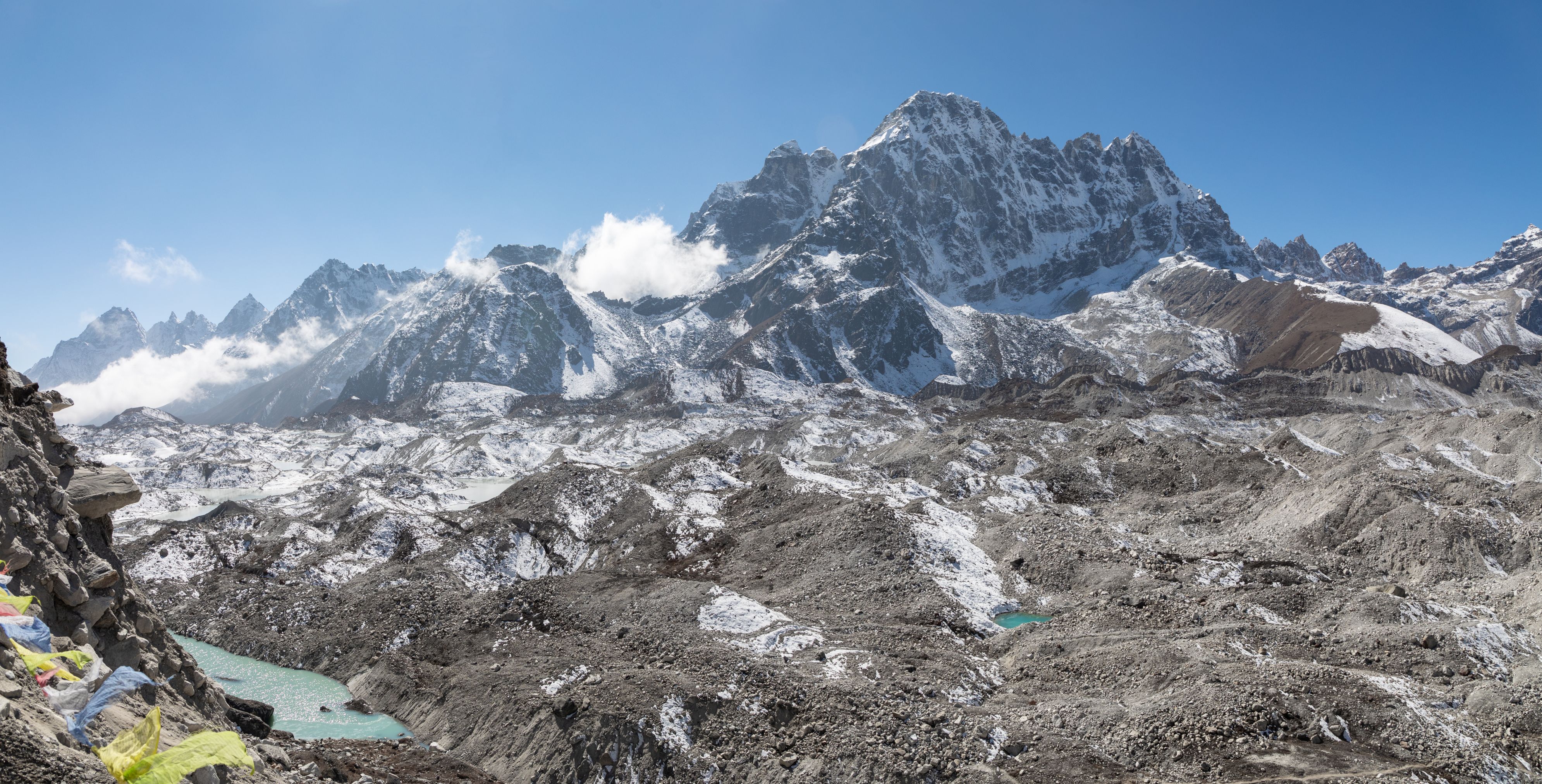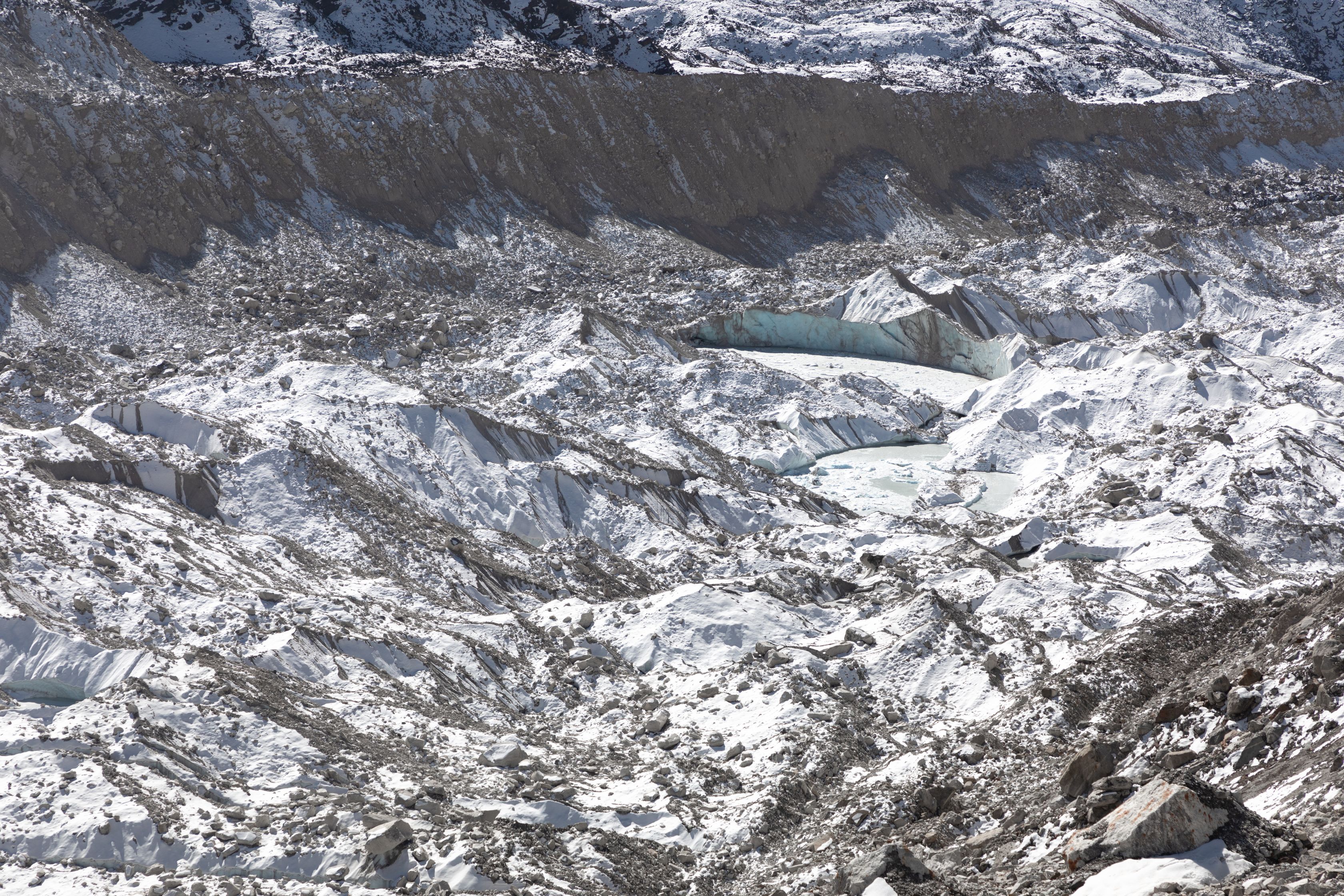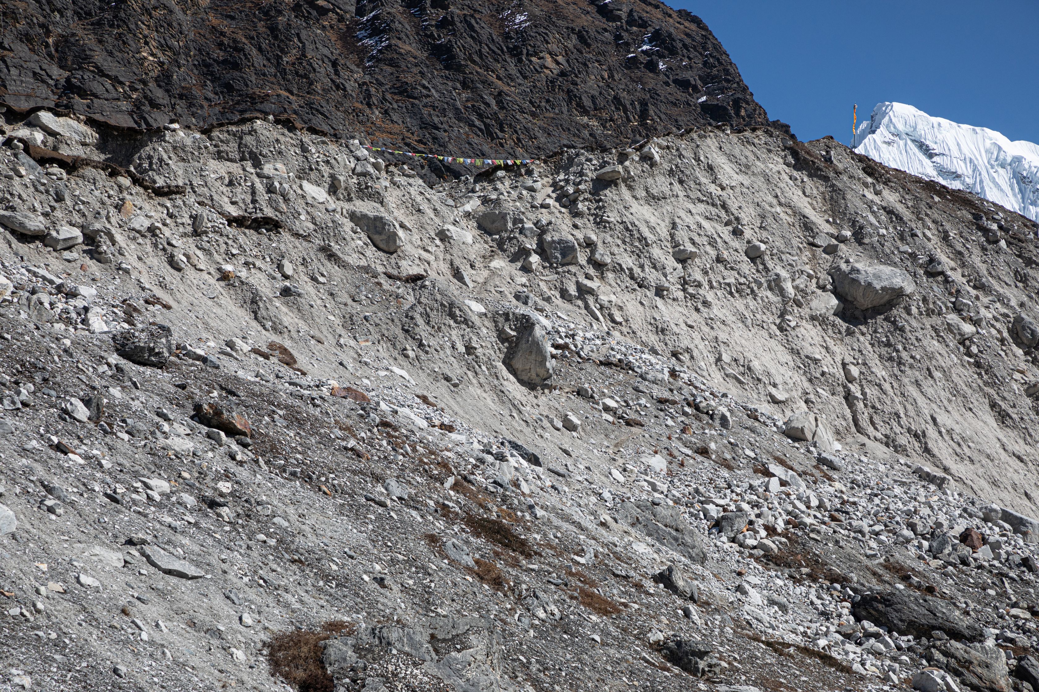 Ta poslední část nám zabrala asi dvě hodiny, ale byla to bez debat ta nejnebezpečnější část z celého treku. Museli jsme přejít Ngozumpa ledovec (mimochodem se svými 36 km jsme o nejdelší ledovec v Himalajích. Když se před námi otevřel, byl to neskutečný, těžko popsatelný pohled. Vidíte všude kameny a hnědou trávu jako někde na Labské louce… najednou za kopečkem sráz dolu a před vámi tato obrovská masa ledu, šedých kamenů a barevných jezer. Pohled byl pěkný, ale vstup na ledovec neudržovaný a nebezpečný. V podstatě se muselo jít téměř přímo dolu asi deset metrů tak 70ti stupňovým svahem suti a padajících kamenů. Ptal jsem se, zda je tam jiná cesta, ale nebyla. Tak jsem dolu hodil mé hůlky a doslova sklouzal po suti, kde nebyl jediný kámen pevný dolů. Ale naštěstí se mi nic nestalo a byl jsem rád, že Meiting nakonec nešla, protože tady by asi měla dost problémy. Pokračovali jsme po ledovci. A ledovce jsou strašidelná místa. Nikdy nevíte, co je pevné, občas padají kameny, slyšíte různé zvuky praskání a šplouchání. Obecně jsem rád, když mám přechod ledovce za sebou.