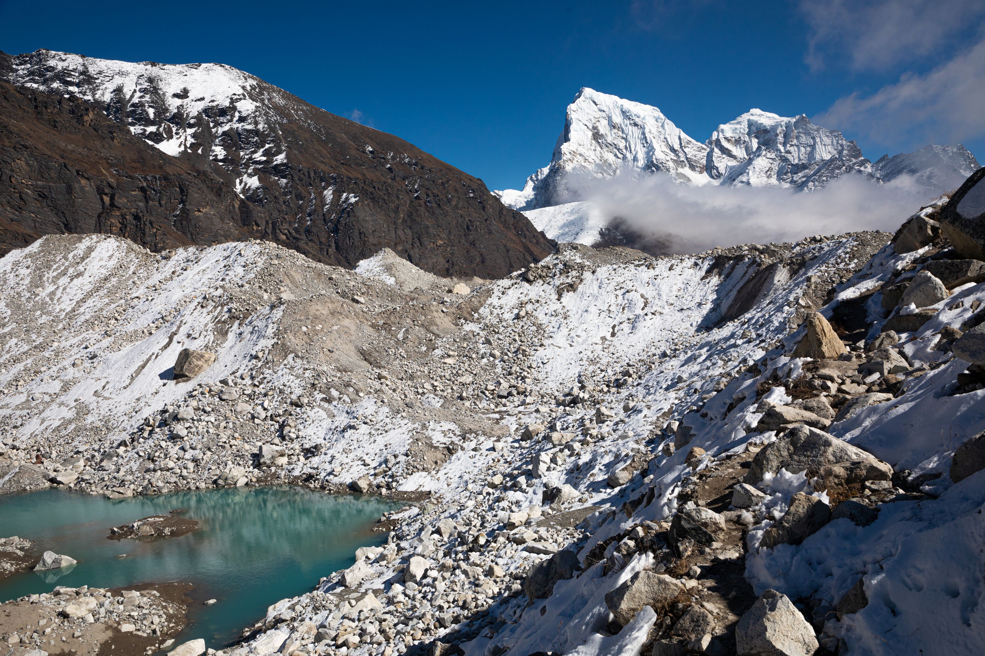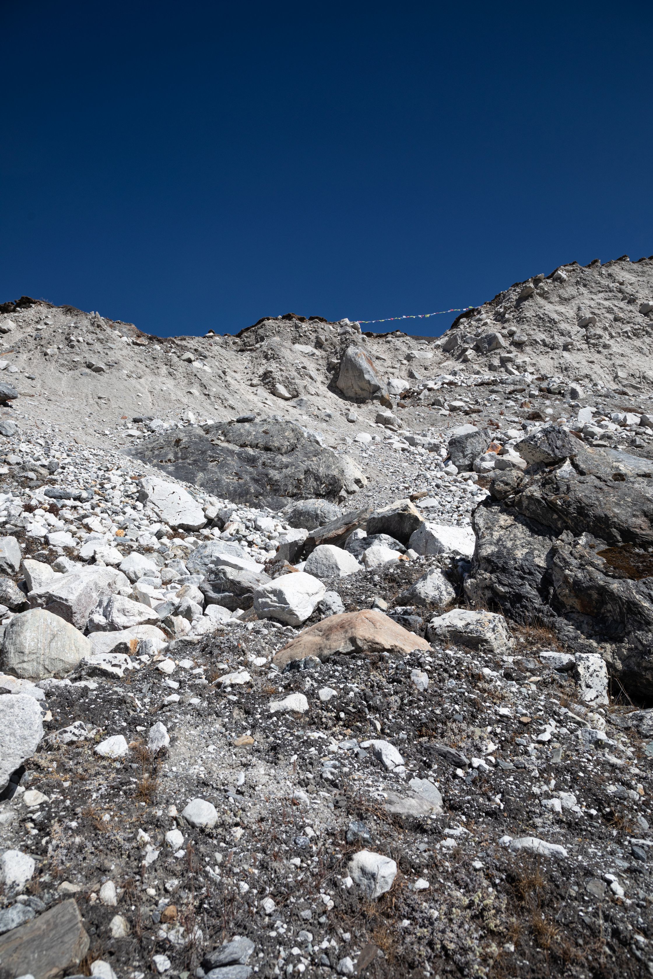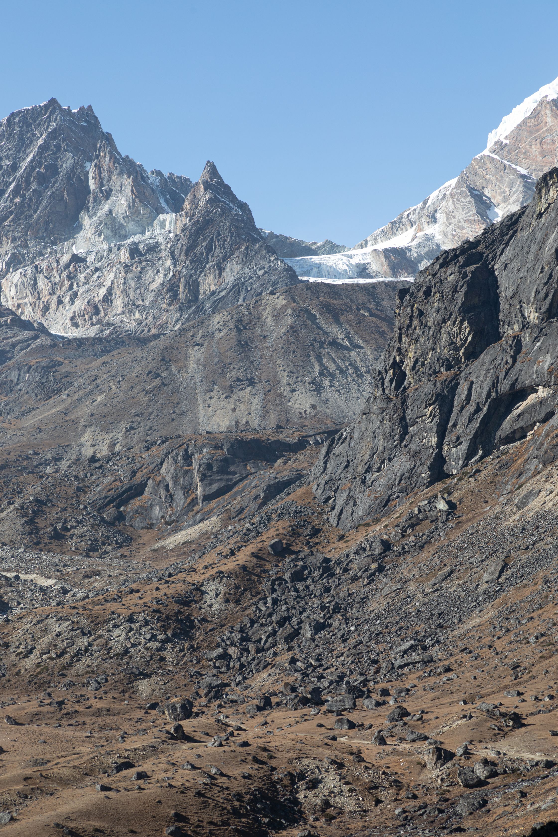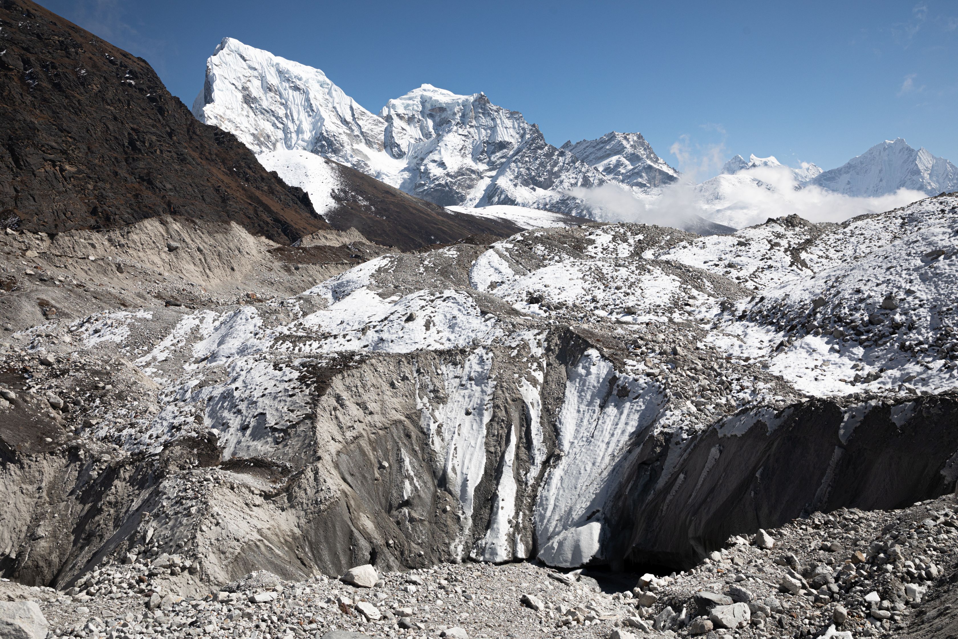 Ta poslední část nám zabrala asi dvě hodiny, ale byla to bez debat ta nejnebezpečnější část z celého treku. Museli jsme přejít Ngozumpa ledovec (mimochodem se svými 36 km jsme o nejdelší ledovec v Himalajích. Když se před námi otevřel, byl to neskutečný, těžko popsatelný pohled. Vidíte všude kameny a hnědou trávu jako někde na Labské louce… najednou za kopečkem sráz dolu a před vámi tato obrovská masa ledu, šedých kamenů a barevných jezer. Pohled byl pěkný, ale vstup na ledovec neudržovaný a nebezpečný. V podstatě se muselo jít téměř přímo dolu asi deset metrů tak 70ti stupňovým svahem suti a padajících kamenů. Ptal jsem se, zda je tam jiná cesta, ale nebyla. Tak jsem dolu hodil mé hůlky a doslova sklouzal po suti, kde nebyl jediný kámen pevný dolů. Ale naštěstí se mi nic nestalo a byl jsem rád, že Meiting nakonec nešla, protože tady by asi měla dost problémy. Pokračovali jsme po ledovci. A ledovce jsou strašidelná místa. Nikdy nevíte, co je pevné, občas padají kameny, slyšíte různé zvuky praskání a šplouchání. Obecně jsem rád, když mám přechod ledovce za sebou.