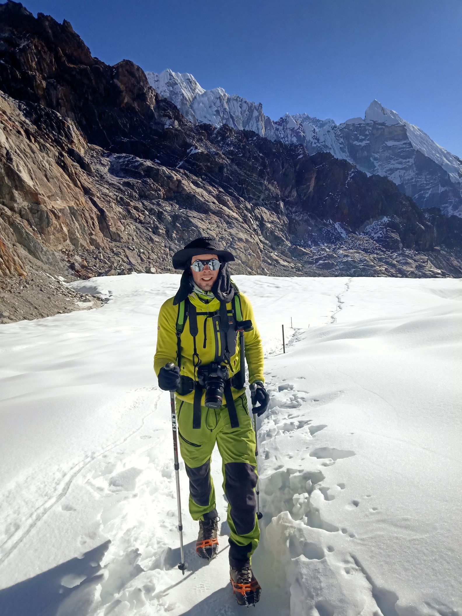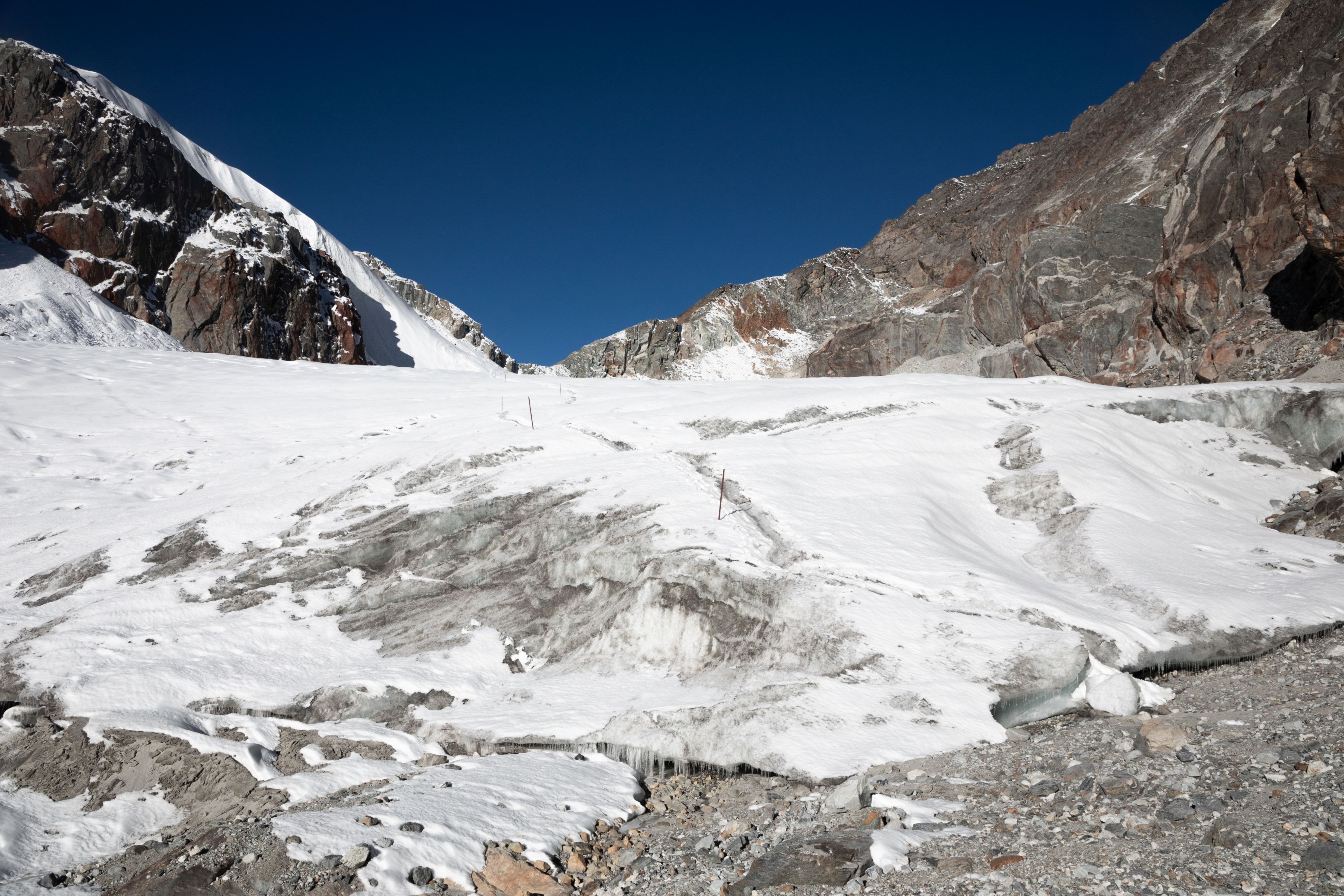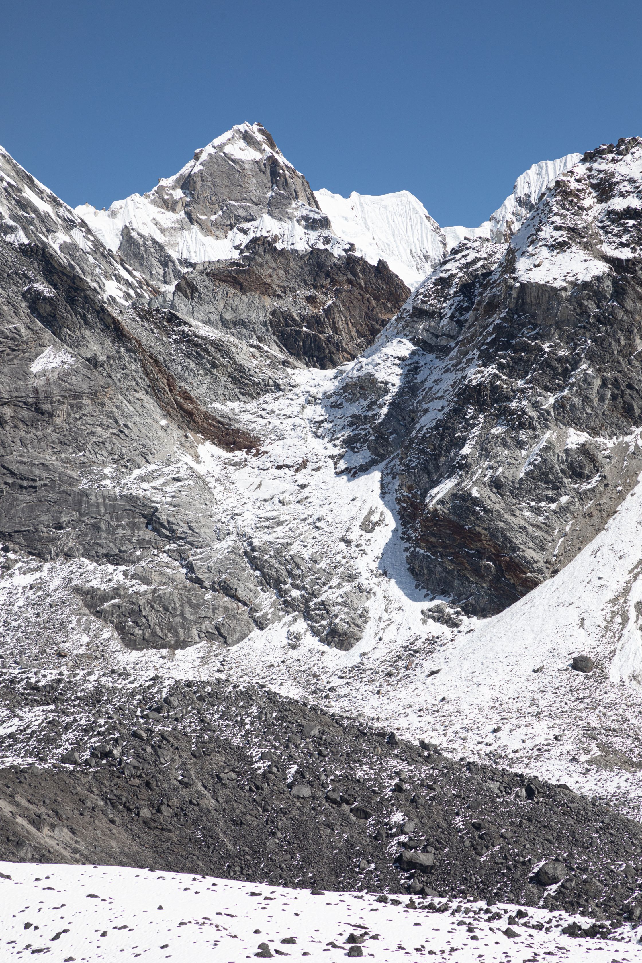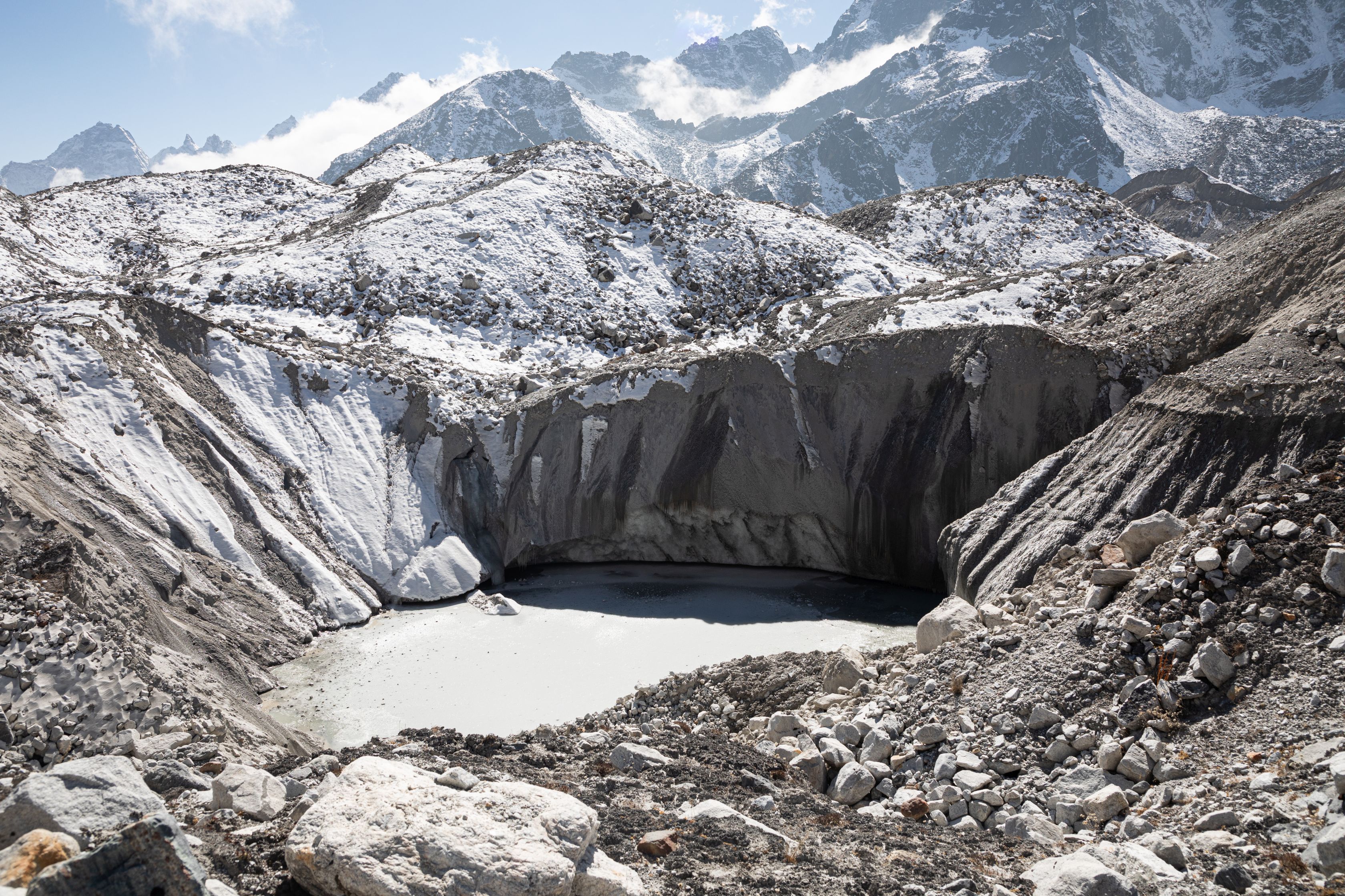 Ta poslední část nám zabrala asi dvě hodiny, ale byla to bez debat ta nejnebezpečnější část z celého treku. Museli jsme přejít Ngozumpa ledovec (mimochodem se svými 36 km jsme o nejdelší ledovec v Himalajích. Když se před námi otevřel, byl to neskutečný, těžko popsatelný pohled. Vidíte všude kameny a hnědou trávu jako někde na Labské louce… najednou za kopečkem sráz dolu a před vámi tato obrovská masa ledu, šedých kamenů a barevných jezer. Pohled byl pěkný, ale vstup na ledovec neudržovaný a nebezpečný. V podstatě se muselo jít téměř přímo dolu asi deset metrů tak 70ti stupňovým svahem suti a padajících kamenů. Ptal jsem se, zda je tam jiná cesta, ale nebyla. Tak jsem dolu hodil mé hůlky a doslova sklouzal po suti, kde nebyl jediný kámen pevný dolů. Ale naštěstí se mi nic nestalo a byl jsem rád, že Meiting nakonec nešla, protože tady by asi měla dost problémy. Pokračovali jsme po ledovci. A ledovce jsou strašidelná místa. Nikdy nevíte, co je pevné, občas padají kameny, slyšíte různé zvuky praskání a šplouchání. Obecně jsem rád, když mám přechod ledovce za sebou.