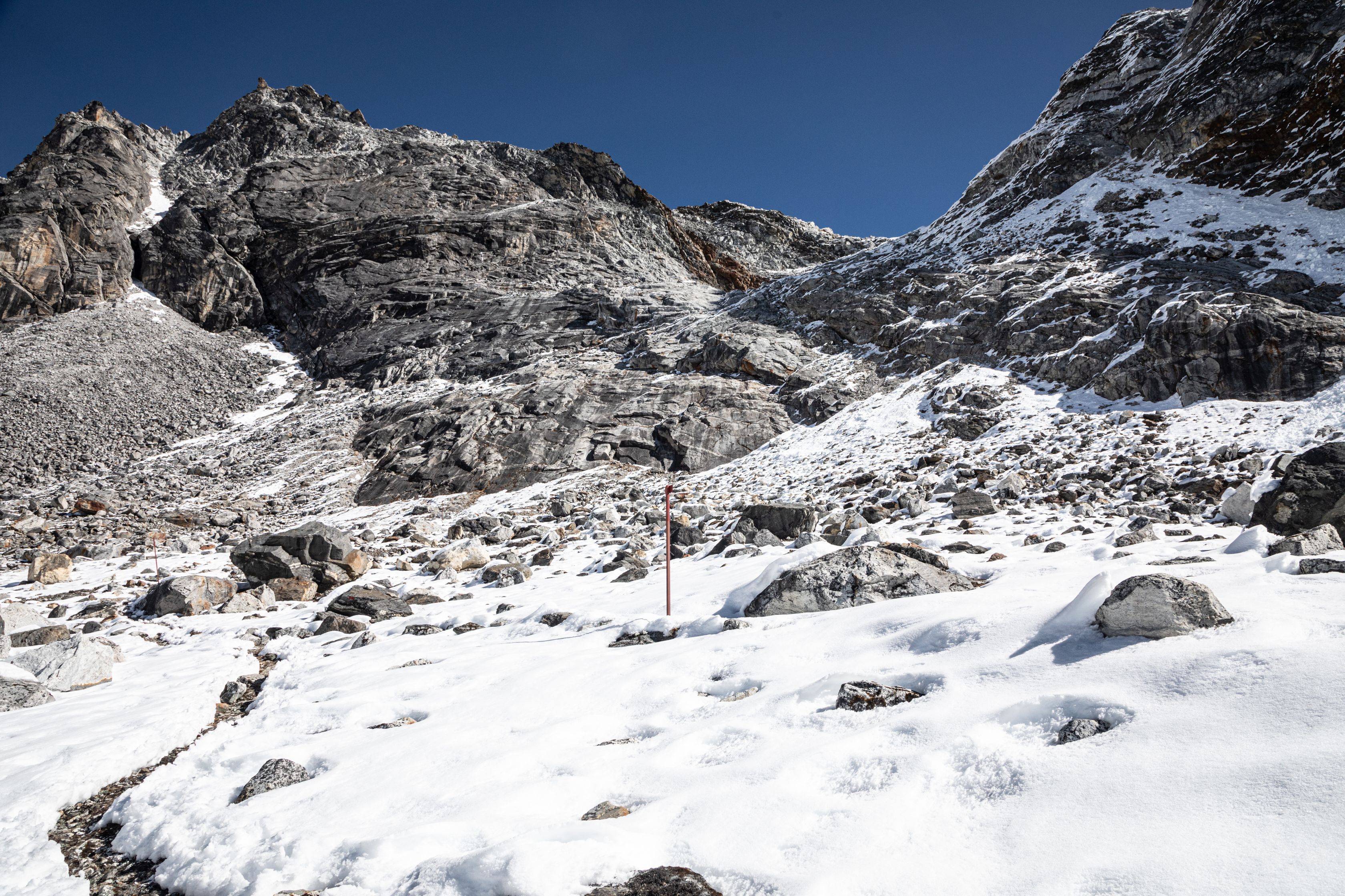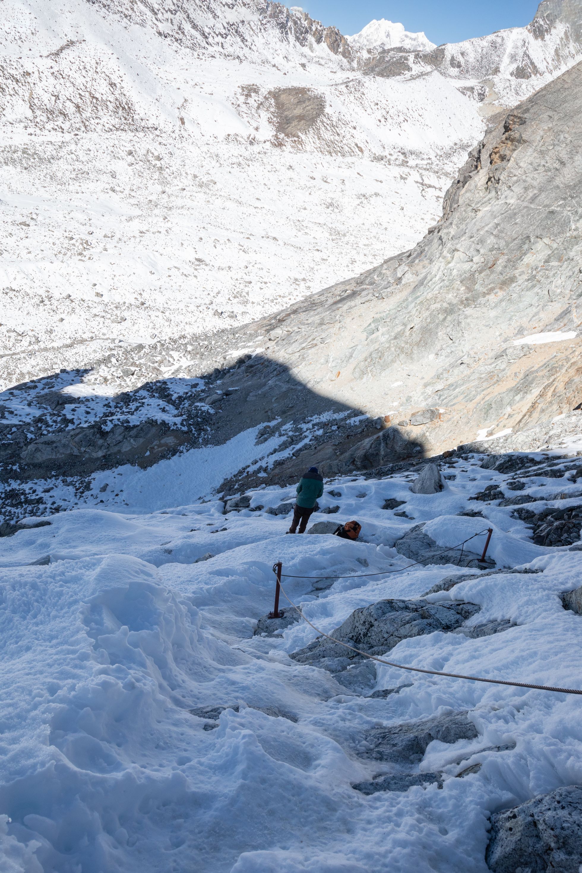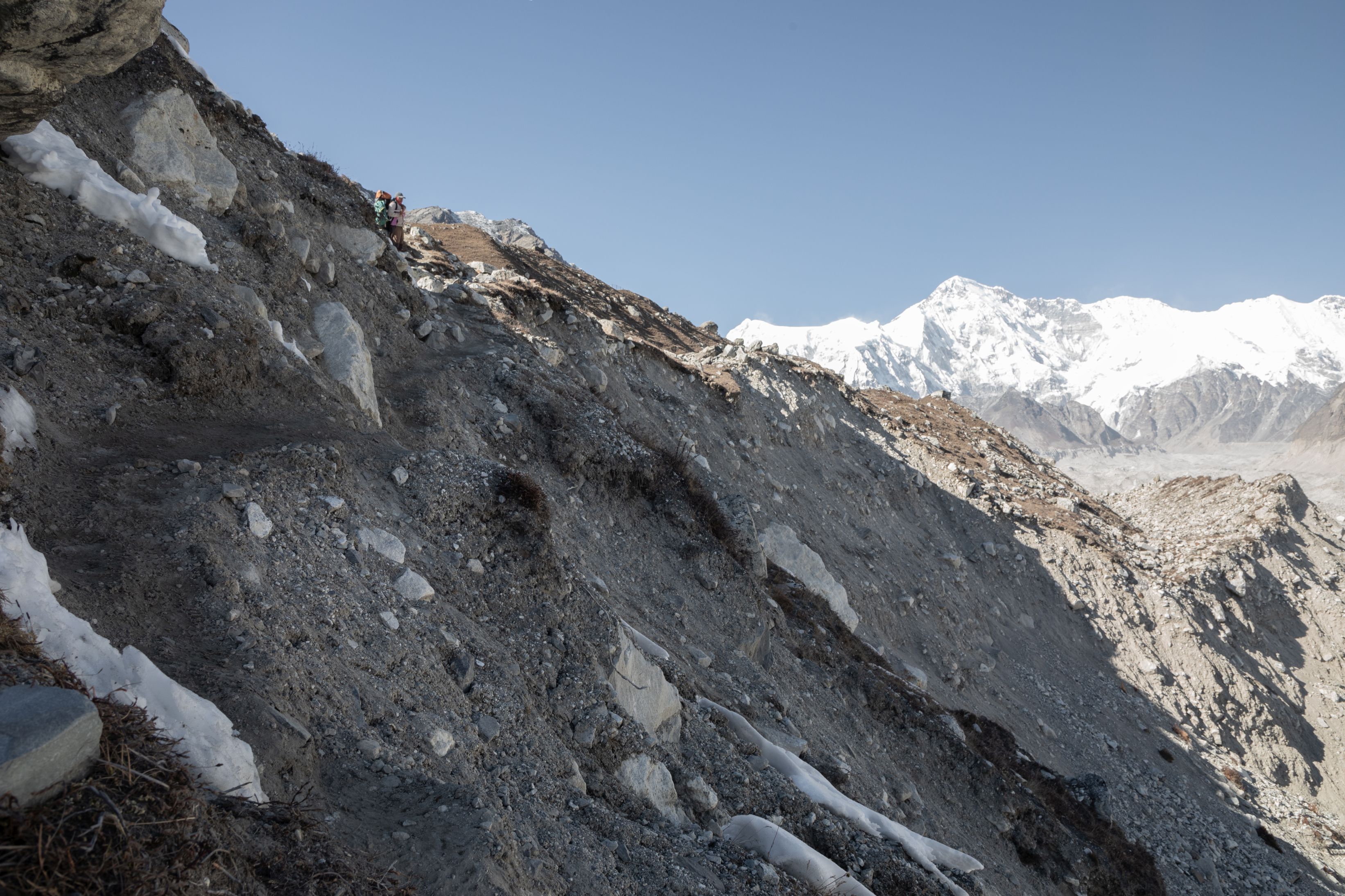 Ale věděli jsme, že nejsme na konci. Cesta dolu měla být super kluzký strmý kameno-ledopád. Zde jsme potkali první lidi jdoucí opačnou cestou. A pak to šlo velmi velmi pomalu, každý krok jsem si promýšlel tři krát. Měl jsem ty nesmeky, které jsem si pořád nandaval a sundaval. Nemohl jsem si dovolit se zranit. Konečně jsme sestoupili tuto strašidelnou stěnu a už jsem věděl, že to dokážeme. Pak byla cesta víceméně mírně dolu do Thagnaku. Místa, kde jsme plánovali přespat. Ale ne. Když jsme tam dorazili, bylo jen teprve poledne a já se rozhodl že když se nám jde tak dobře, tak že to ještě dnes zvládneme až k jezerům Gokyo.