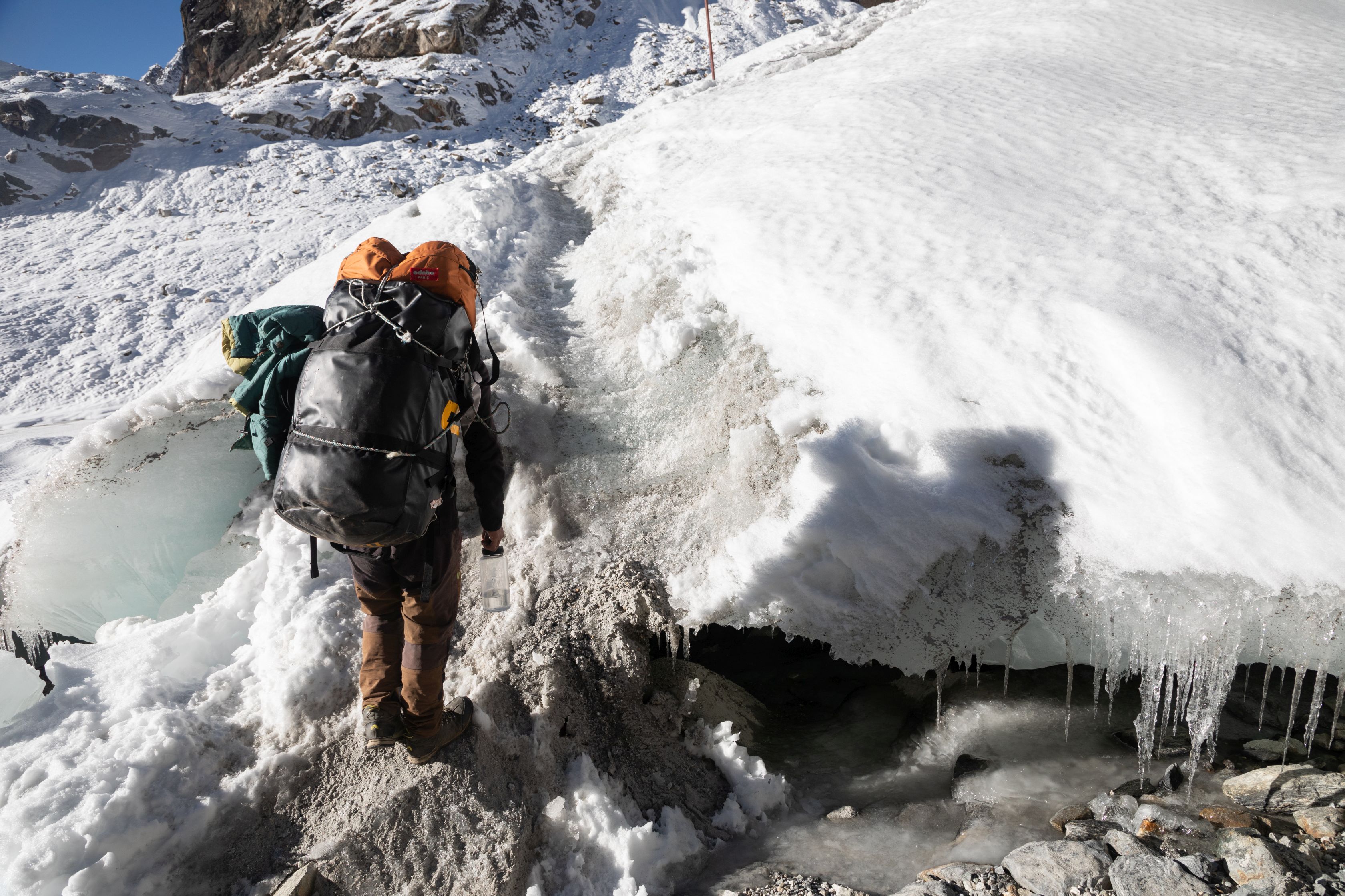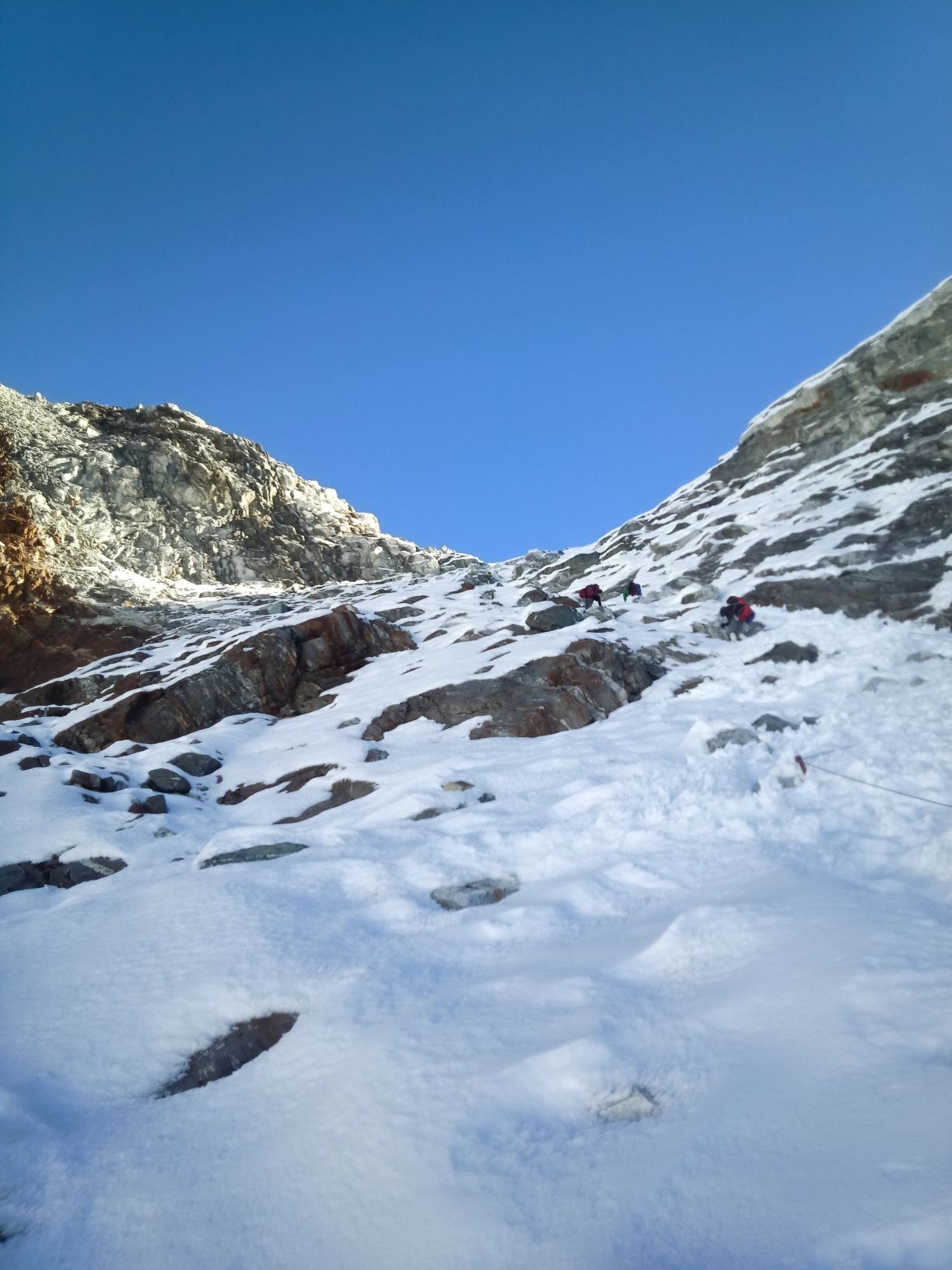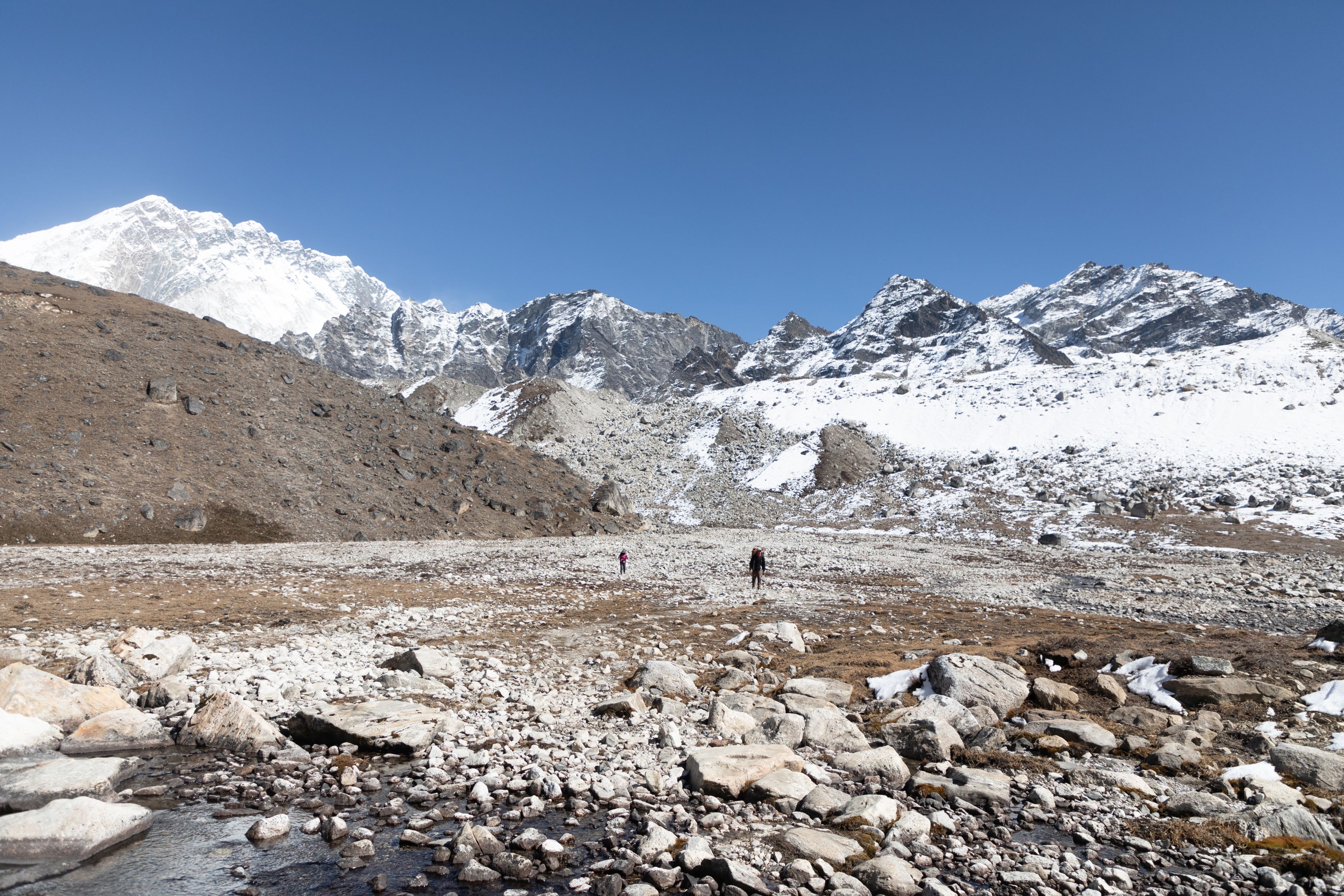 Ale věděli jsme, že nejsme na konci. Cesta dolu měla být super kluzký strmý kameno-ledopád. Zde jsme potkali první lidi jdoucí opačnou cestou. A pak to šlo velmi velmi pomalu, každý krok jsem si promýšlel tři krát. Měl jsem ty nesmeky, které jsem si pořád nandaval a sundaval. Nemohl jsem si dovolit se zranit. Konečně jsme sestoupili tuto strašidelnou stěnu a už jsem věděl, že to dokážeme. Pak byla cesta víceméně mírně dolu do Thagnaku. Místa, kde jsme plánovali přespat. Ale ne. Když jsme tam dorazili, bylo jen teprve poledne a já se rozhodl že když se nám jde tak dobře, tak že to ještě dnes zvládneme až k jezerům Gokyo.