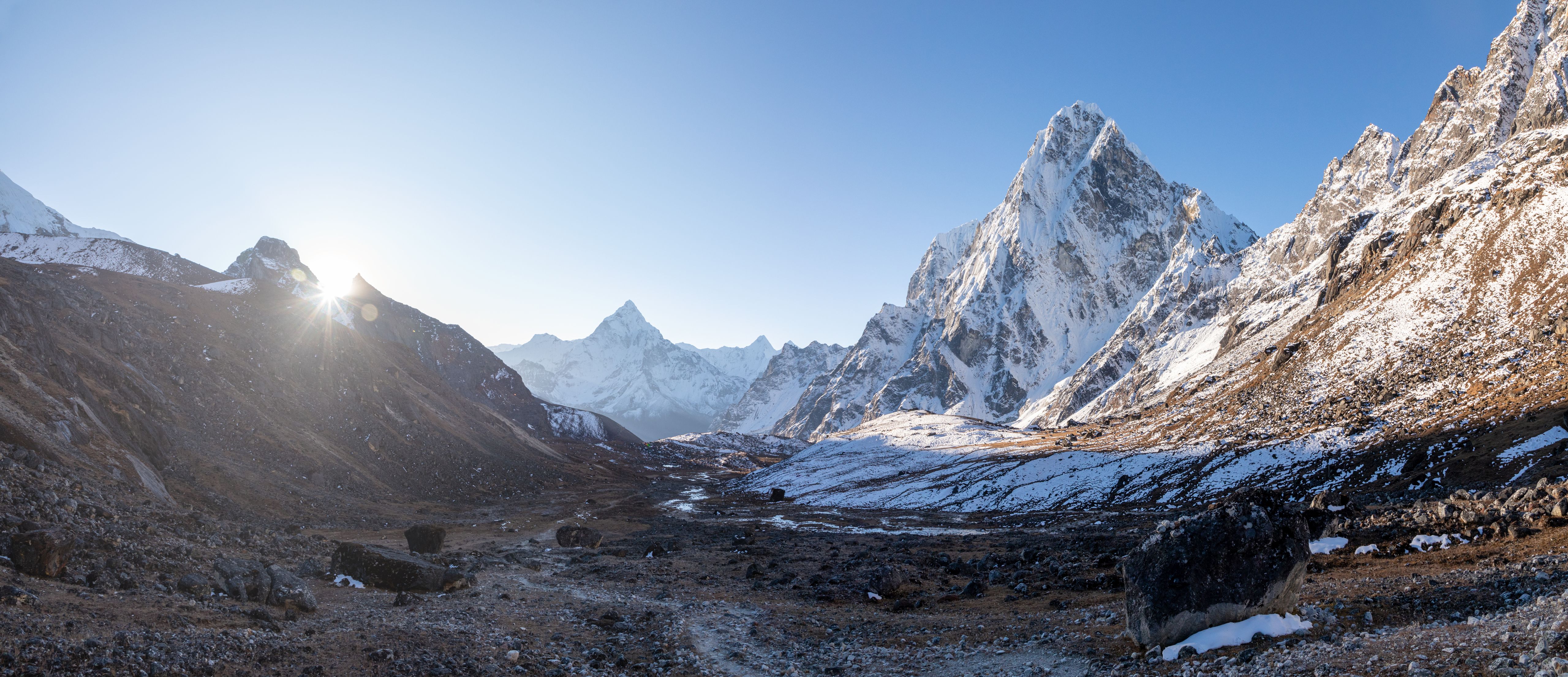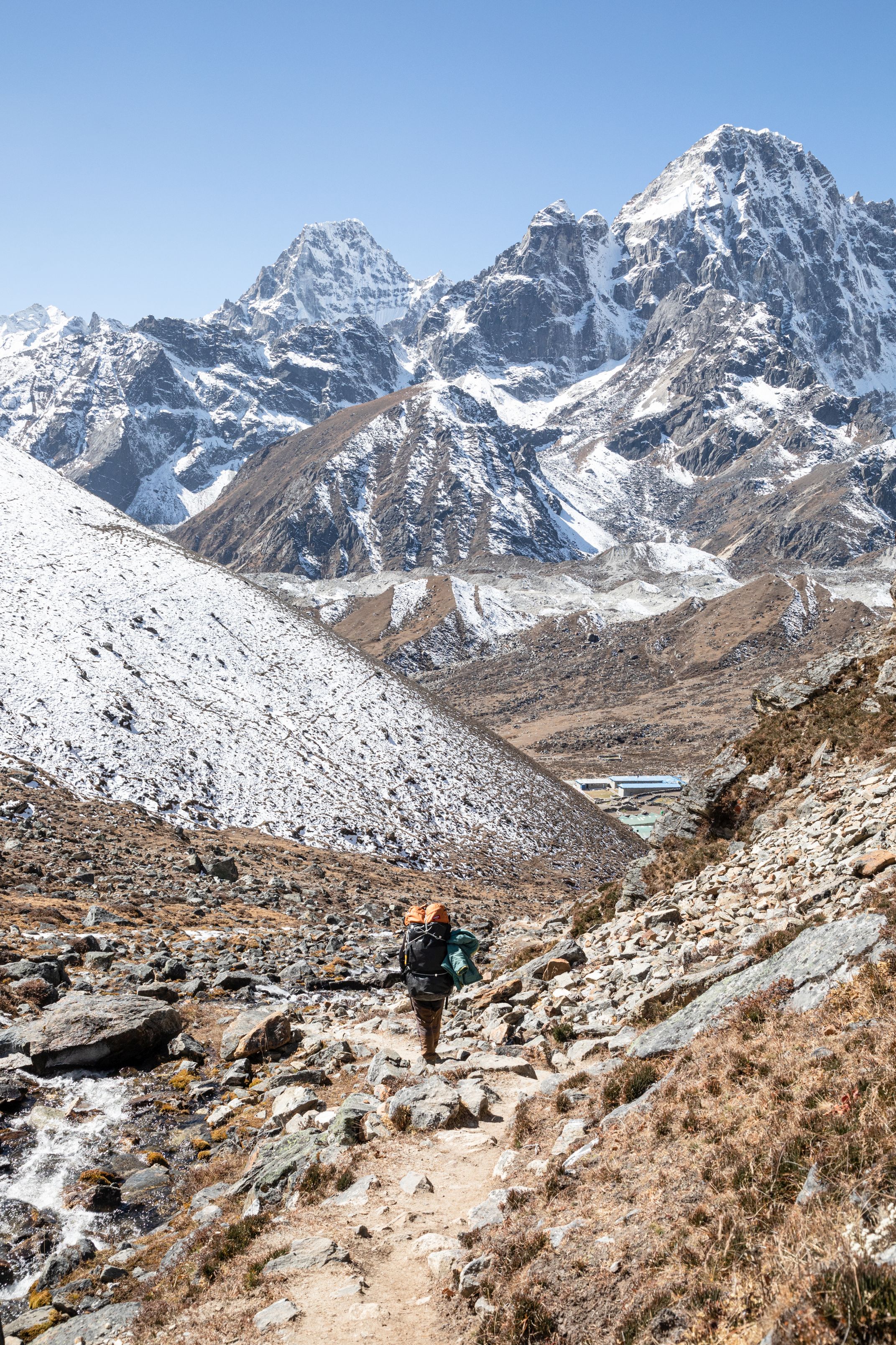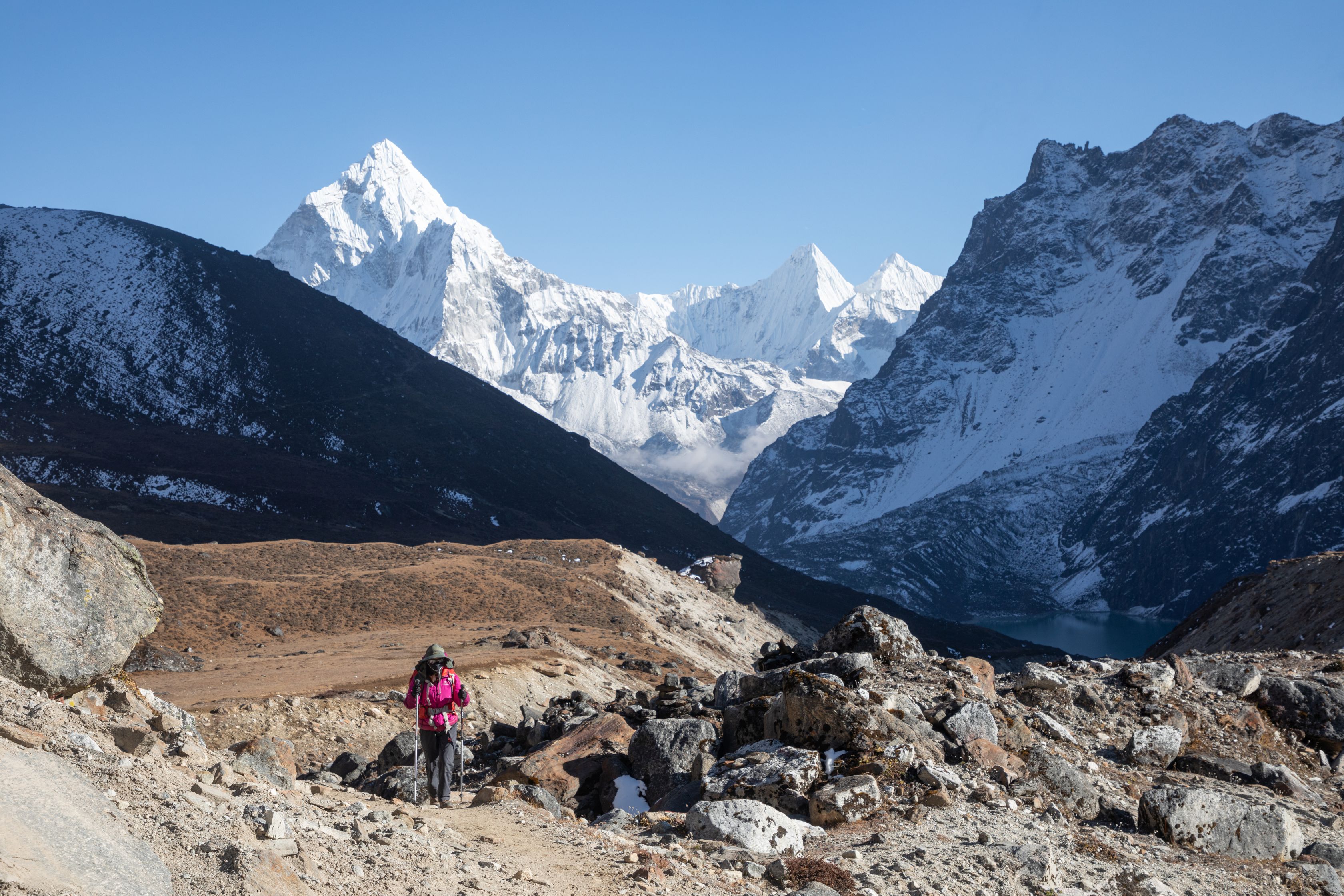 Po výborném Gorak Shepu pod Everestem jsme se sbalili a vyrazili na cestu k jezerům Gokyo. To vyžadovalo sejít dolu údolím Khumbu, kolem Lobuche a dále se odklonit na západ kolem strašidelně strmé stěny Cholatse (6440m) do Dzongly (4830m). To byl první den, pak přechod sedla Cho-la pass (5420m) a zpět dolu do vesnice Thagnak (4710m) a nakonec přechod přes ledovec Ngozumpa k jezerům Gokyo (4790m). To nebyla jednoduchá cesta.