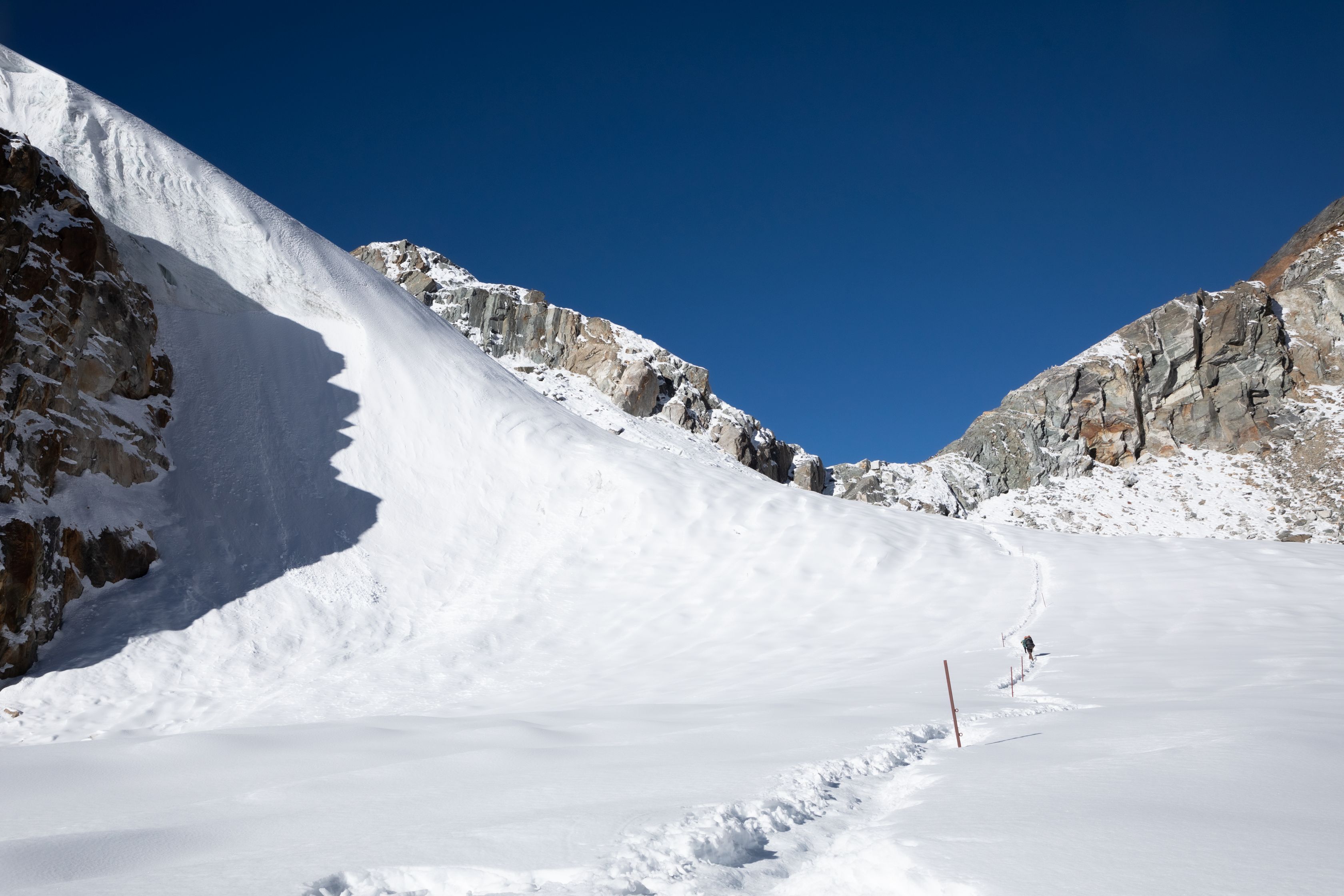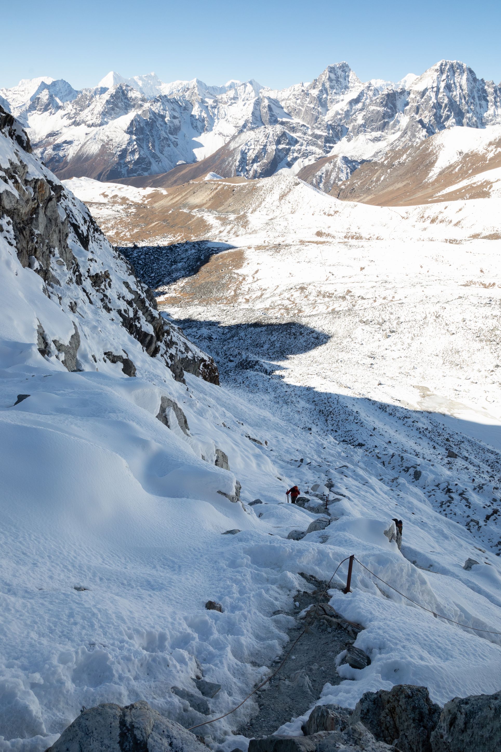 Já jsem s Reensim vstal brzo a na cestu se vydali v 6:30. První část cesty byla bezproblémová, prostě jen nahoru, nahoru, a zase nahoru. Po asi 500 výškových metrech nás čekal přechod malého zasněženého ledovce. Vždy se trochu bojím chodit po ledovci bez uvázání. Zvlášť když není v okolí nikdo, kdo by nám případně zavolal pomoc, kdybychom zapadli do spáry. Ale naštěstí se nám nic nestalo a došli jsme na druhý konec jen pár metrů pod Cho-la passem. Tam pak bylo pár kamenů, která vyžadovalo použití lan a rukou, tak jsme si navzájem podali zavazadla a po té stanuli na hřebeni mezi dvěma krásnými údolími.